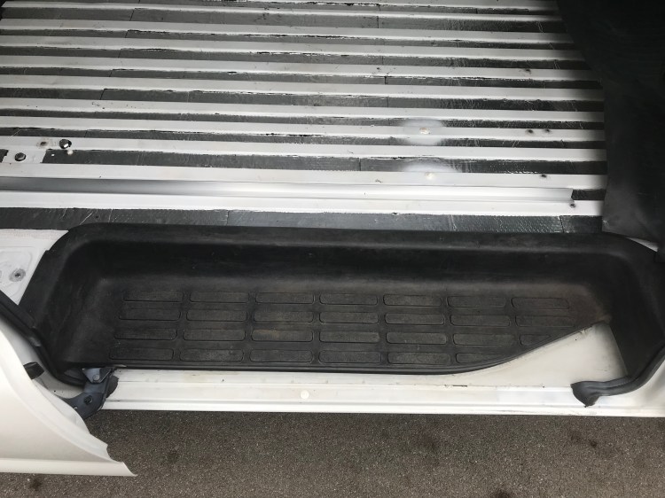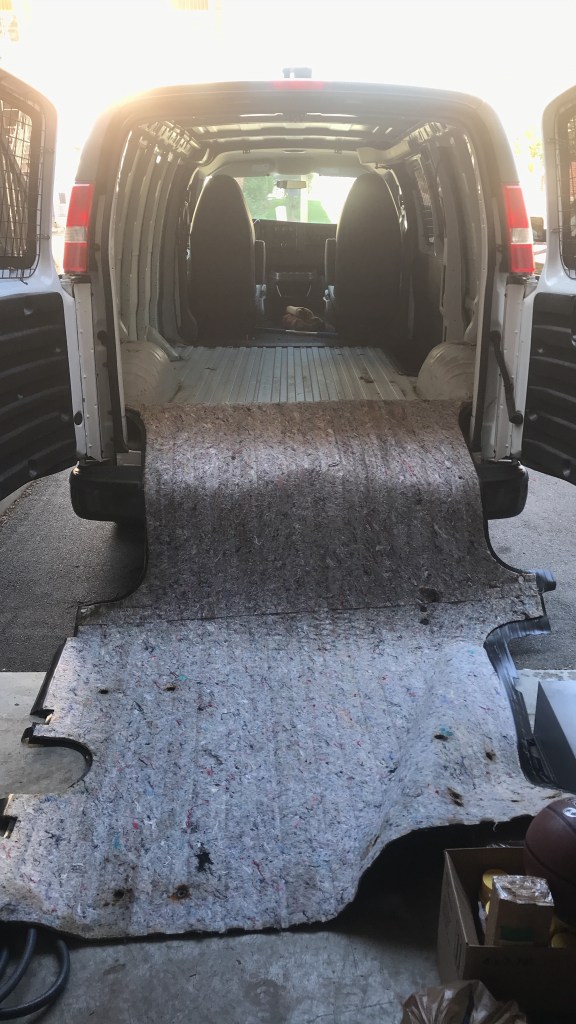 Next was the rubber mat. THIS was easy! I simply had to pull it up and out of the van. Some edges were wedged under rubber trim on the steps at the side and back of the van, and it was somewhat heavy, but simple enough. There was some sort of fabric under the mat that had a weird smell to it… but otherwise an enjoyably efficient process. I will likely end up bringing the mat to the junkyard, but for now I am considering using it as a floor template – not all the edges were accurate, going under or extending over the edges of where my floor will be, so when the time comes I will probably put it back in the van and score or trace the edges to a more accurate template. I’ve also seen some vanlifers keep the rubber mat as part of their flooring. Into The Mystery used it in his Chevy Express build to aid in insulating the floor. The fabric evidently comes off if you soak it under a hose.