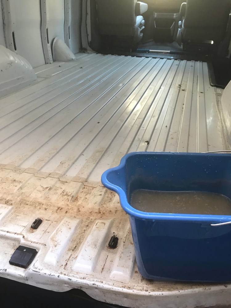 I incorporated the test into a pre-existing plan to wash the van. I simply took a hose and held the running water over every window and door seal, then hopped in the van and made note of any locations where water was getting inside. Initially, I used high water pressure with a hose nozzle, directing it straight at the seals – this was probably overkill and not a realistic representation of what rain would do. But I also checked the van interior after heavy rainfall and there were a few spots along the back door’s seals, and a minor spot on the side door where water was getting in and I could see that the rubber seals were a bit worn.