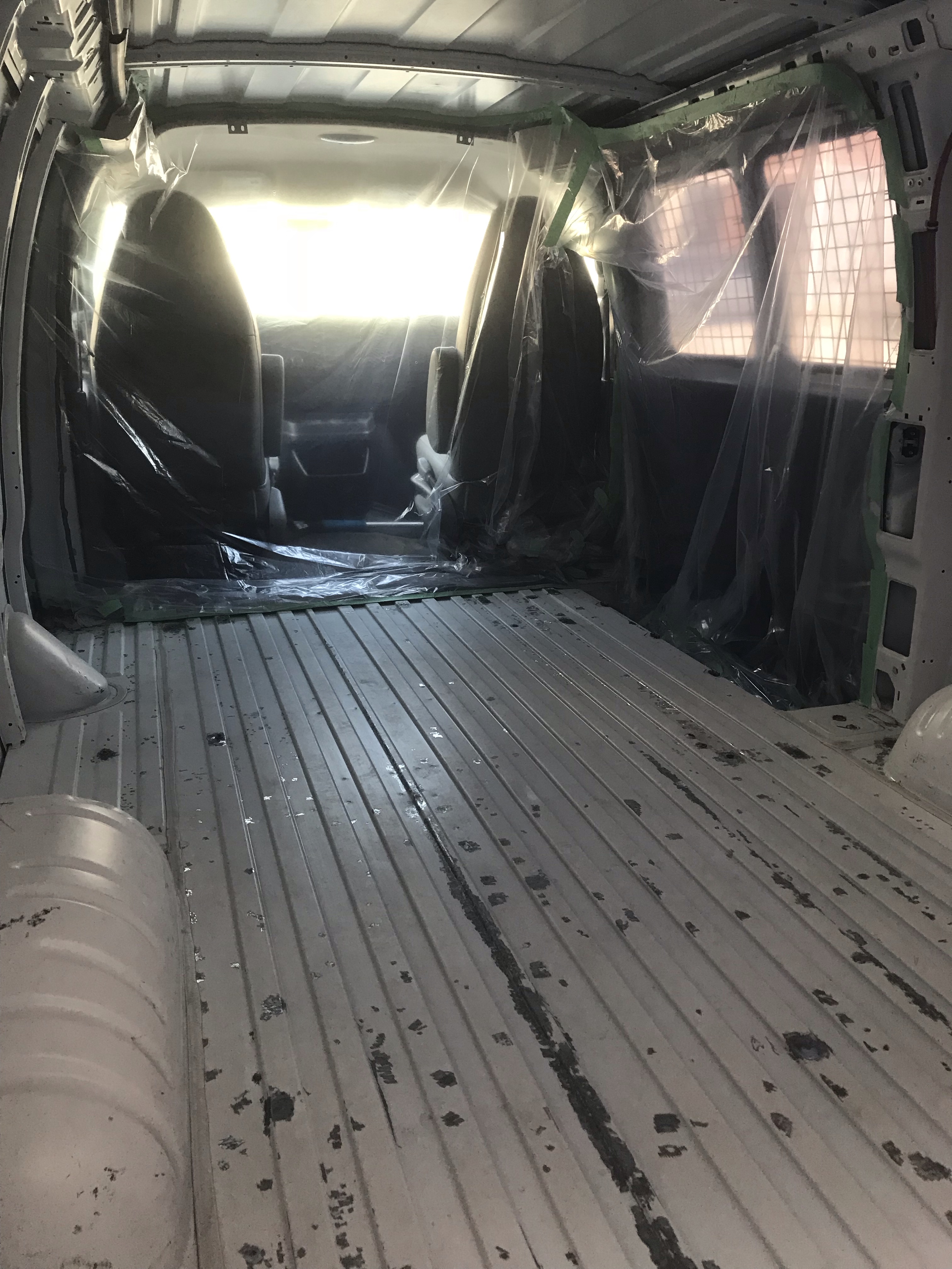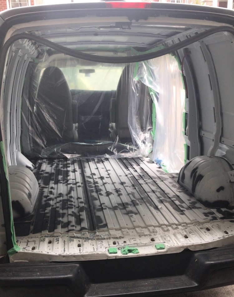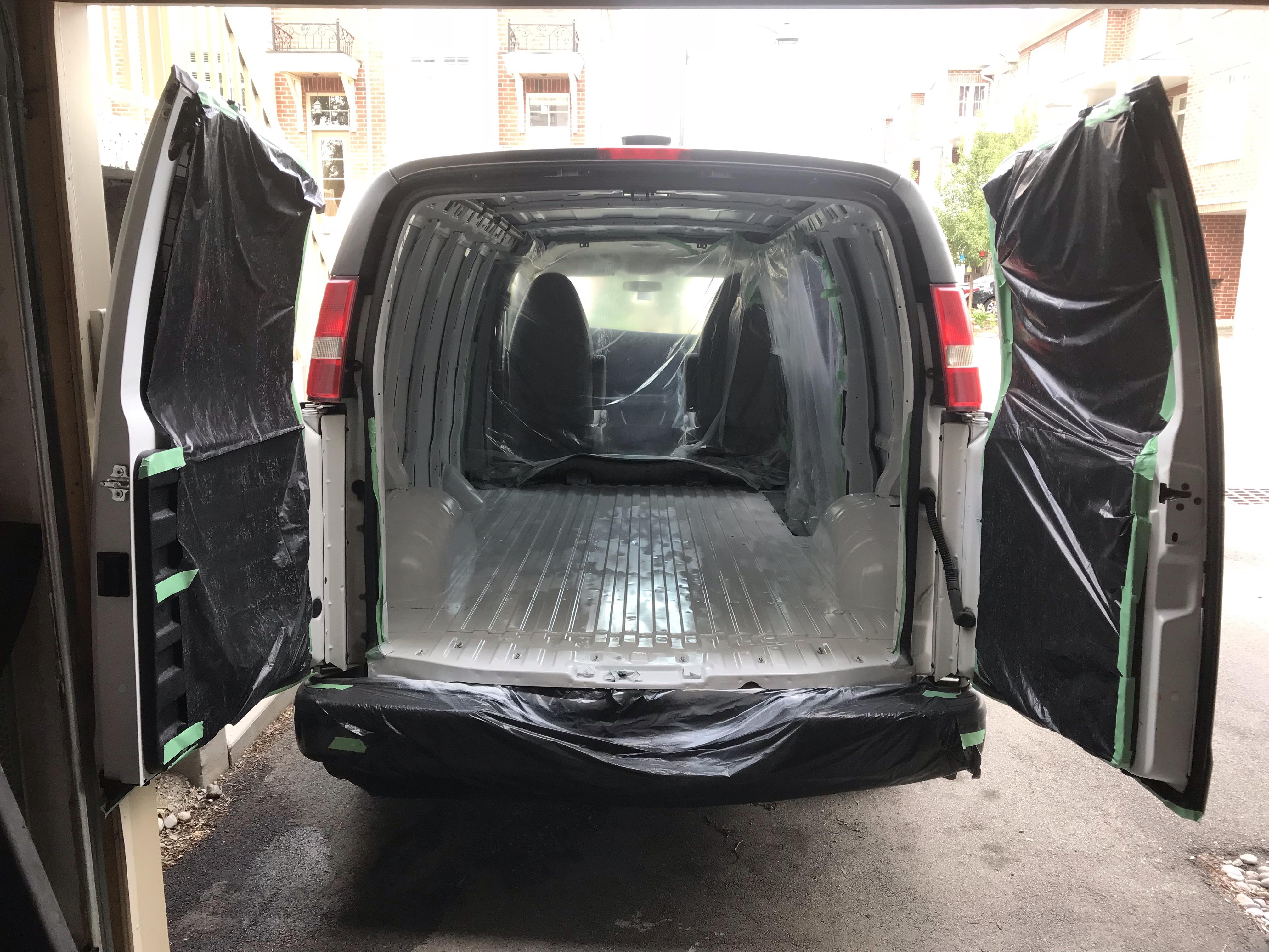 In preparation for painting I used painter’s tape, some plastic mattress covers I had handy, and garbage bags to cover any areas of the van on which I did not want to get paint.