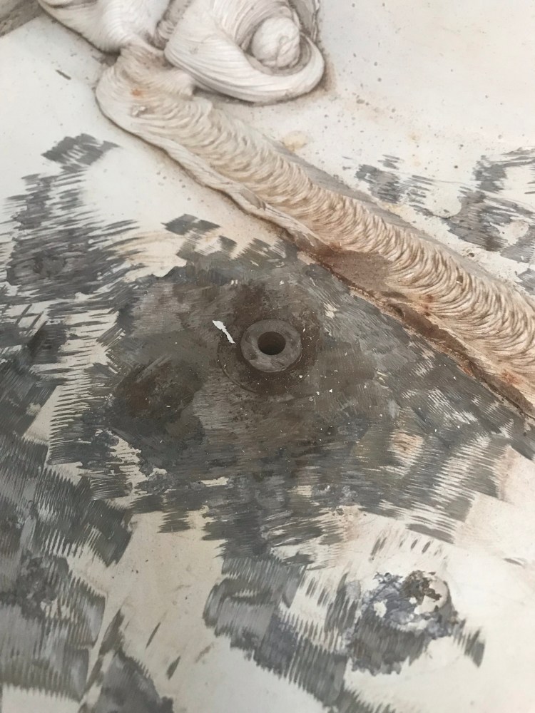 The hole in the sidewall had housed something that still remains a mystery to me (if anyone knows what it is I’d love to know!) I decided to go with it. I cut off the excess rubber tubing, took it apart, rust reformed and painted the outer shell, and filled the inside with polyurethane, also adding a little adhesive under the nuts.