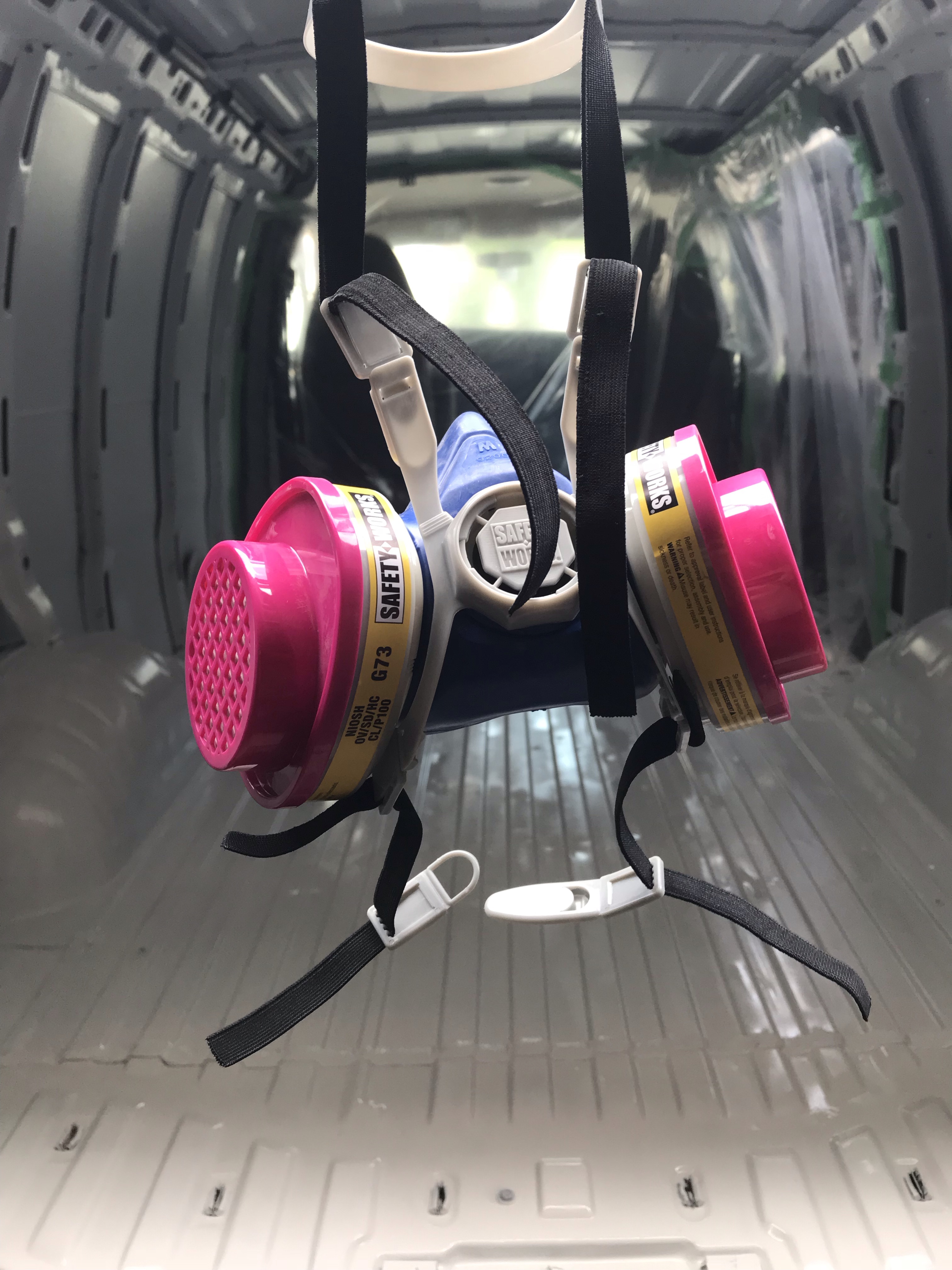 I chose to use Rust Oleum’s white gloss spray paint. Application was easy and quick, but there were a couple of drawbacks. I didn’t find the spray application to be even and after one coat I could still see the black rust reformer underneath, so I needed a second coat (I probably used at least 6 cans to cover the floor and some spots on the ribs, walls, wheel wells, and ceiling). I also found out that this paint may be conducive to at least staining, at worst mold and mildew. I hadn’t fixed my rear door rubber seals yet and they leak so when it rains I put towels down in the back of the van. One night more water got in than usual, and although these were microfibre towels, they were wet long enough that the paint underneath turned pink in spots. Google said that this could be mildew. I washed the spots with rubbing alcohol and even Concrobium mold control, but the stain was in good. I do wonder if it was just dirt from the towels sinking in to the paint. To be safe, if I were to do the painting again I would use a paint that is explicitly marketed as mold-resistant, which the Rust Oleum paint is not, and potentially waterproof. Although the Rust Oleum paint does say it can be used as indoor and outdoor.