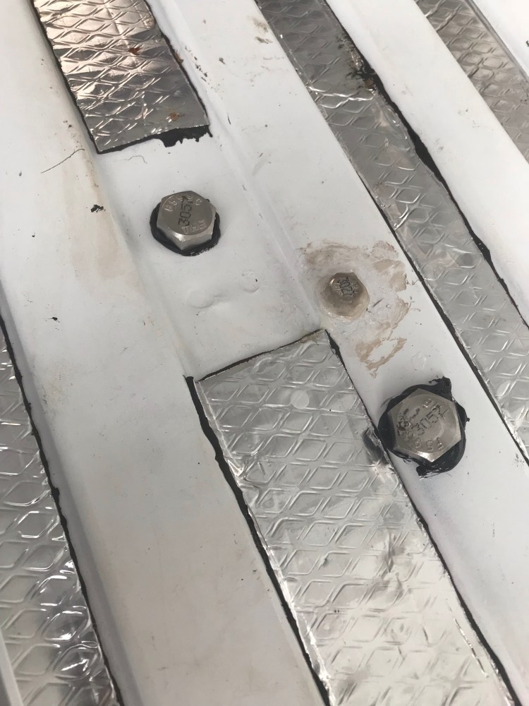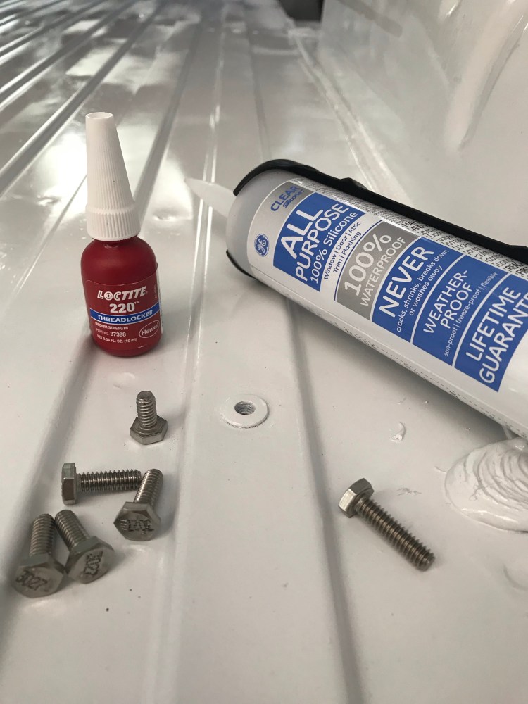I used a socket and ratchet to tighten the bolts and once they were half way down I applied a medium threadlocker to help keep them in place during constant vibration of the van while driving, then tightened all the way down. I then cleaned around and on top of the bolt heads and sealed them. While I initially used a silicone caulk for it’s waterproof and flexible properties, I was unable to find any explicit information regarding how this would hold up with vibration. I’ve since decided that Dicor self-levelling lap sealant is the gold standard (well known in the RV world). Though I would also look into Sikaflex (polyurethane-based, flexible, shock-absorbent, high strength) or an automotive grade sealant. Gloves, eye protection, and respirator were worn during this process.