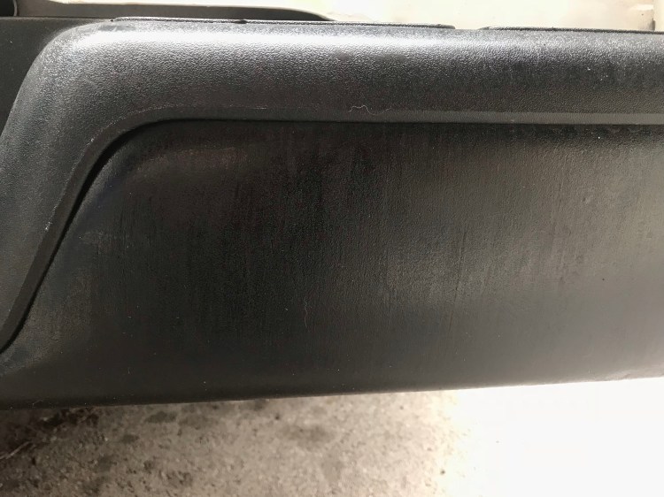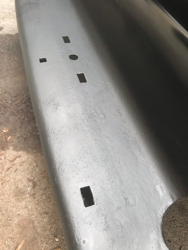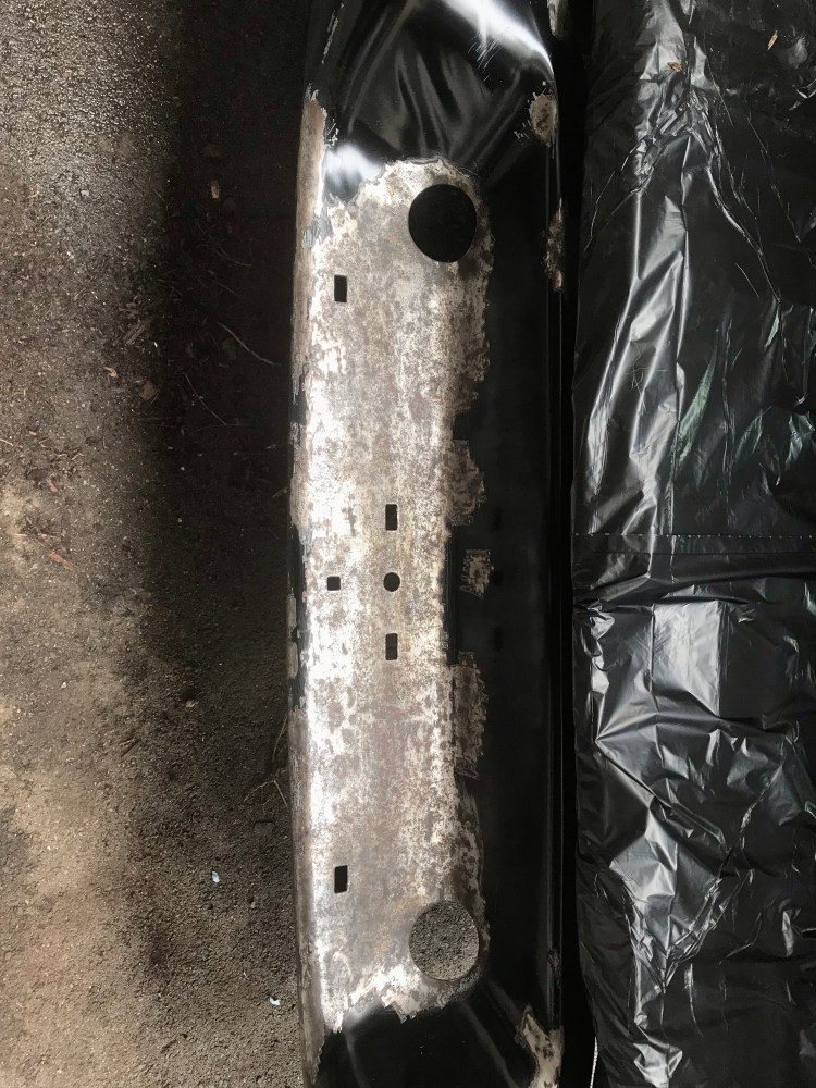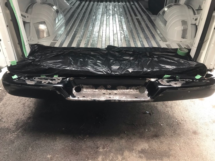 There were also a few rusting spots, though tiny, on the front bumper, but when I looked at how the cover was attached to the metal here from beneath I decided to leave it in place and just sand the visible rust. I finished (hopefully) the rust escapades by wiping down the front bumper and back step with rubbing alcohol.