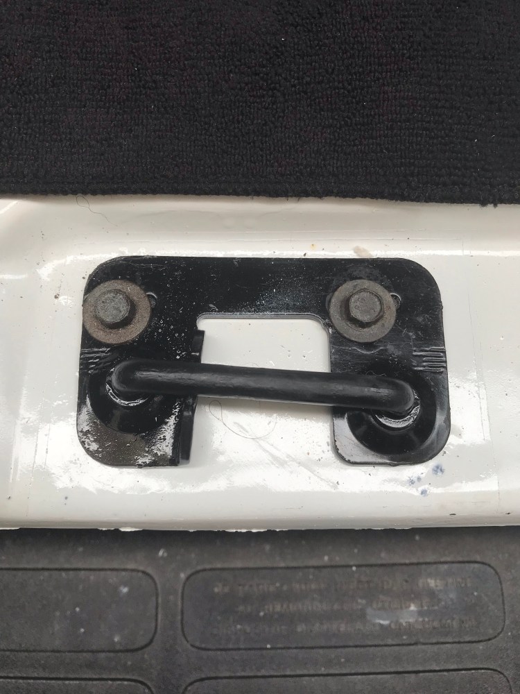 I decided against pulling out the front seats and front mat. I was able to pull up the back of the front mat and it seemed okay underneath, with just a bit of surface rust around four screw holes – which I was able to reform without pulling up the whole mat. The fasteners holding the seats down are a bit rusty and there is wiring under the seats as well – I figured it might be tough to remove and I felt out of my depth with the wiring. But I may still decide to do this at a later date.