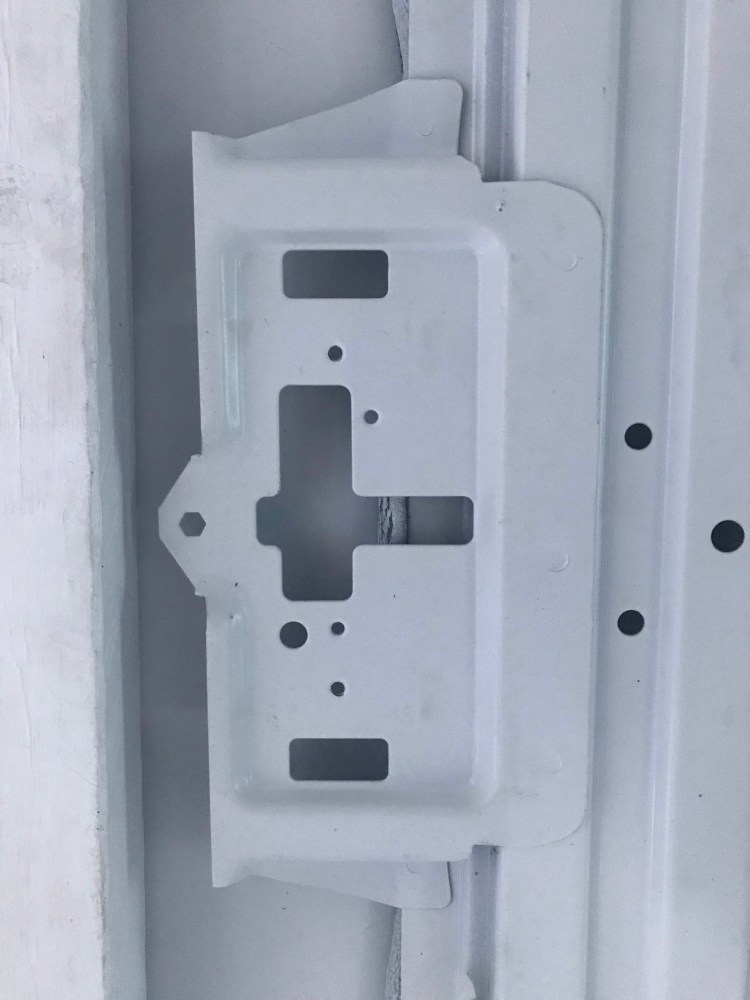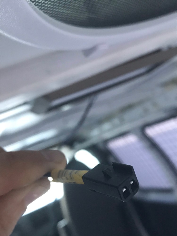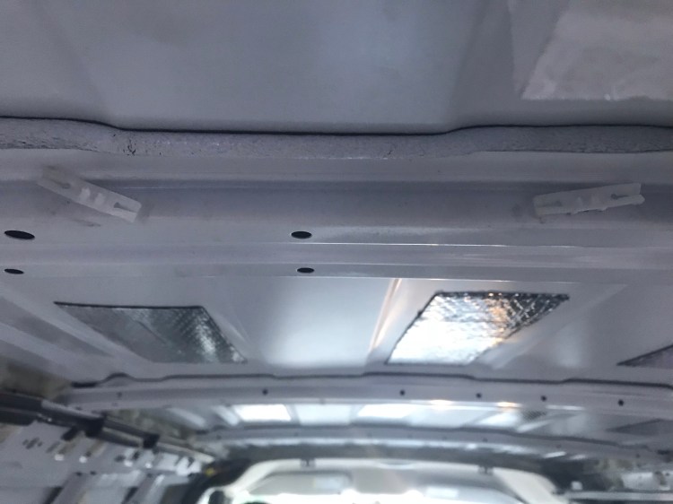 Lastly, there is a light on the cargo bay ceiling that I removed. Chevy had a piece of metal welded to a van rib and then a plastic holder for the light attached to that. There is wiring that lines the cargo bay on the driver side extending from the front of the van to the rear lights which will stay in place and another wire extends from here to the middle of the ceiling where the light is. It took a bit of fiddling, but I finally figured it out. So in the event that anyone else had an issue with this, here’s what to do. For the wiring there is a connection midway between the light and the main wiring along the side ceiling rib (branching off what’s headed to the brake lights). I pulled out the two grey tabs and then bent the plastic on one side to separate the two parts/ wiring to the light. There were two small wires held to plastic clips in the ceiling rib with electrical tape. I couldn’t pull the clips out so I took the tape off instead and might cut the clips out later. For the light, I first took the white covering off by pushing in on the edges at each end. This revealed two screws underneath. I removed these and the other parts followed. I was left with the metal holder that is welded to the ceiling rib.
