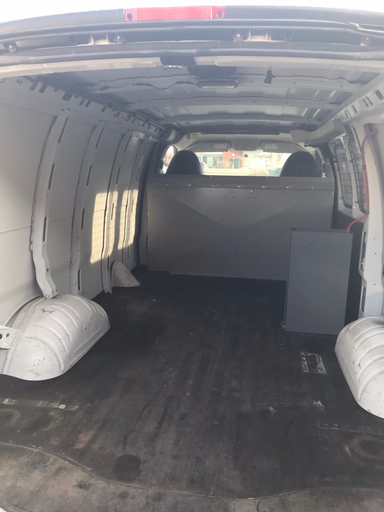 Next up was the divider, separating the front seats from the cargo bay. When I went to take it out it proved to be a huge headache. I got most of the bolts and screws out that were holding it together and to the van’s floor (I treated myself to a wrench set and it kind of felt like Christmas), but several were rusted and stuck, and the two sides of the divider were riveted in behind the van’s interior panelling. I tried a couple of methods to remove the blind rivets (hammer a steel chisel under the edge of the rivets or drill into the rivets) – but with no avail. I needed to bring the van to a Chevy certified body shop – people who new the make of the van, how to remove and re-attach the panelling, and who would have better luck with the rivets.