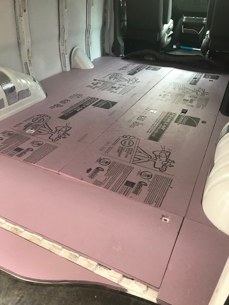 I was temporarily considering expanded polystyrene (EPS; R-4.0 per inch) when I saw someone using it because it compressed more easily. Their thought process was that it would compress on top of the raised ridges in the van’s corrugated floor and fill in the lower ridges. This meant less height taken away in the van, and for me filling in those lower ridges would be a big plus since I still wonder if those pockets of air could create space for condensation and water to become trapped, creating a potential for rust or mold (If anyone has experience with this or info re: moisture and air gaps in a sealed van floor please comment below!). I ended up deciding against EPS due to its moisture permeability and degradation under constant vibration – which would not be good in a van.