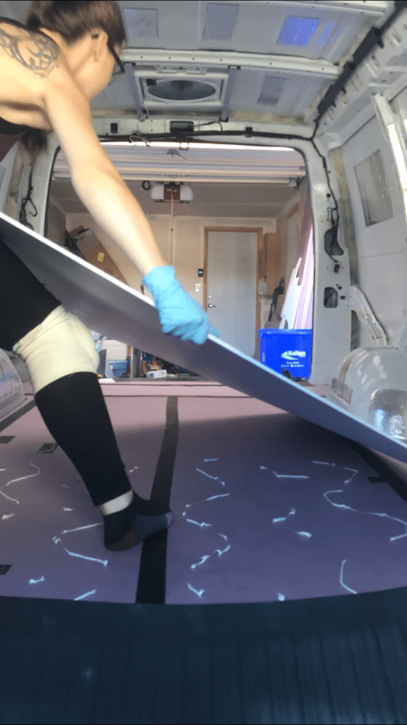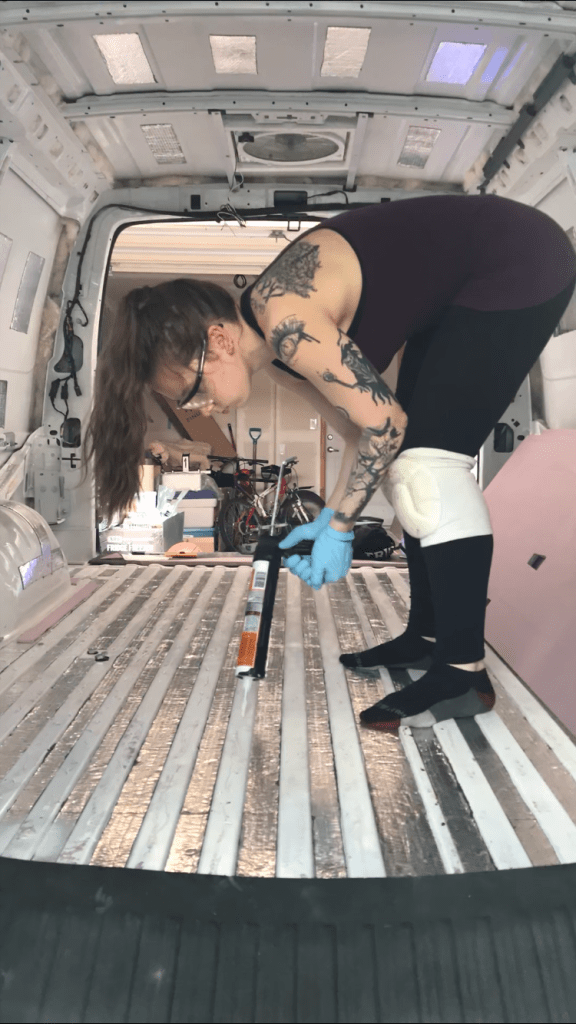 In terms of adhering the XPS insulation to the van floor I was initially going to use 3M Hi-Strength 90 Spray Adhesive. But here’s the issue: it eats rigid foam! I had seen many other van lifers use 3M 90 and felt that it was a good quality product (which I have no doubt that it is if you use it correctly). The label went on and on with its list of materials you can use it with, so I didn’t think twice about it not being compatible with foam insulation. And it didn’t take long for me to notice the reaction once I started to spray – the adhesive sizzled and my foam insulation disappeared before my eyes! I learned that the high acetone content in this (and most) spray adhesive(s) is the culprit. I did have to pull up some XPS from the van floor, but it wasn’t too hard considering the foam’s deterioration, meaning it hadn’t adhered well. My beautiful clean floor now had adhesive and pink foam residue – but since I would be gluing again I didn’t bother to clean that off.