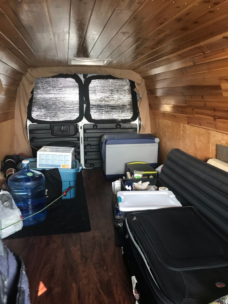 Because all of my belongings were in containers for the most part (my clothes were in a suit case, plus the fridge, power station, and bucket for bathroom emergencies), I had put mats under them. My hope was that the mats would protect my beautiful vinyl floor from scratches as well as keep things from sliding. I drove carefully, trying not to brake too hard and taking turns slowly, but things still moved. I ended up using a bungee cord, which I tethered to the van walls and wrapped around the smaller objects – this did a great job up preventing things from moving around too much while driving.