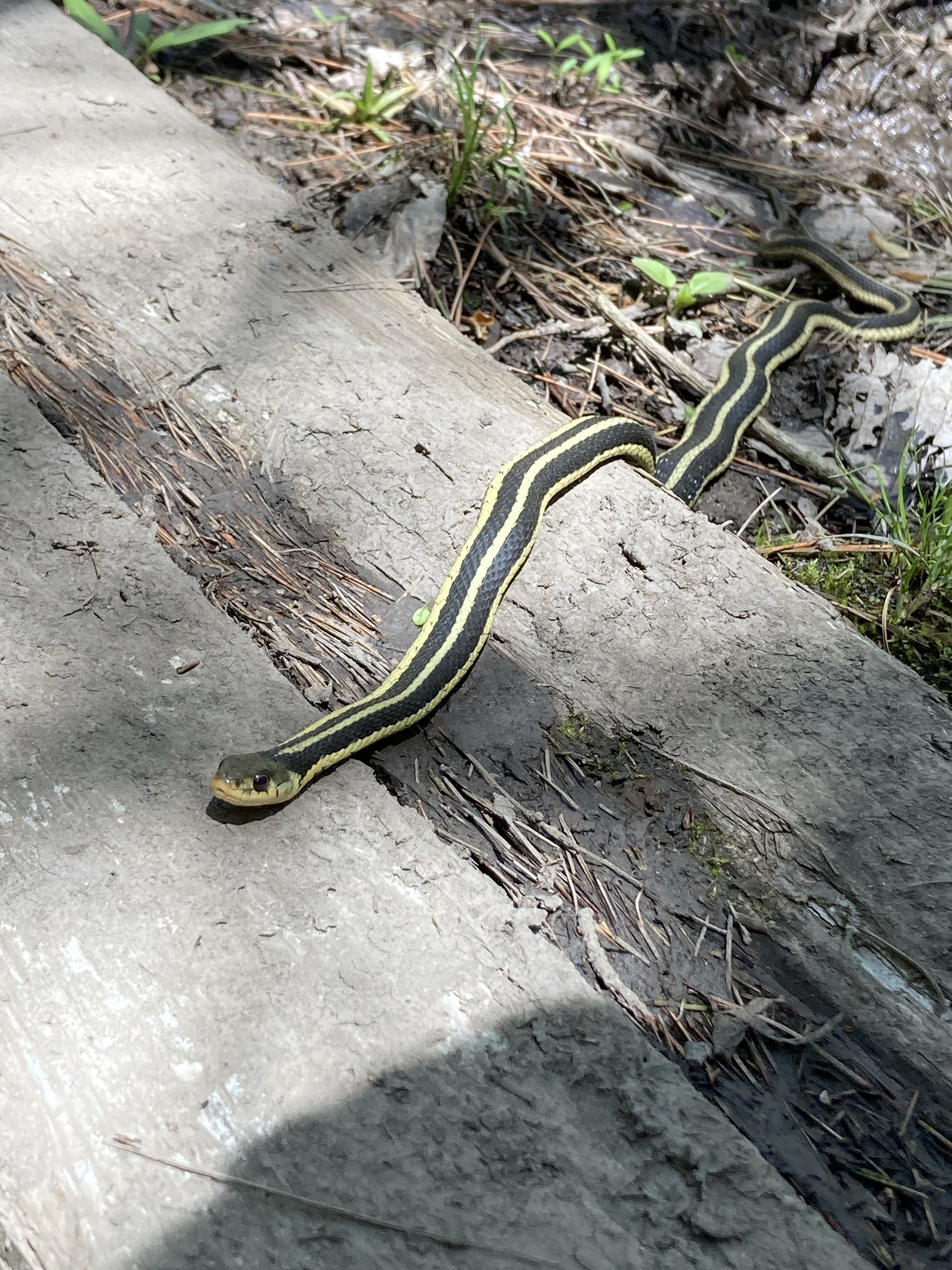 It was a fairly hot and sunny day. I thoroughly enjoyed the trail near point 04A. I got to see a porcupine climb a tree, many snakes sunning themselves, a turtle crossing the road, a few deer in the distance, and lots of dragonflies. At one point two geese waddled away from me, one in front and one behind their group of fuzzy children – I thought that was neat how they guarded them. This was probably the most scenic day of the entire hike! The shade of forest and wind helped with the heat. Proximity to water level brought on the mosquitos. There were several sections of trail – mostly the northern part of Gould lake and private land – that I found to be somewhat overgrown and easier to lose the trail. Also with Poison Ivy. I was grateful that Frontenac had a machine dispensing Gatorade, as I was making my way through the 2L of water I was carrying too quickly for such a long day (I do still carry a filter and tabs in the event I find myself in a pinch). The mosquitoes were still young, with a few adults pestering me – I decided to call them skeets (mo-skeet-os). I also had another swarm of black flies descend when I got back to my bike. I had to race the sun a bit on my bike ride back to the van (I usually cycle first, but on the odd day I’ll switch it up), but I made it, and it was a lovely ride – running from the black flies and viewing the lakes.