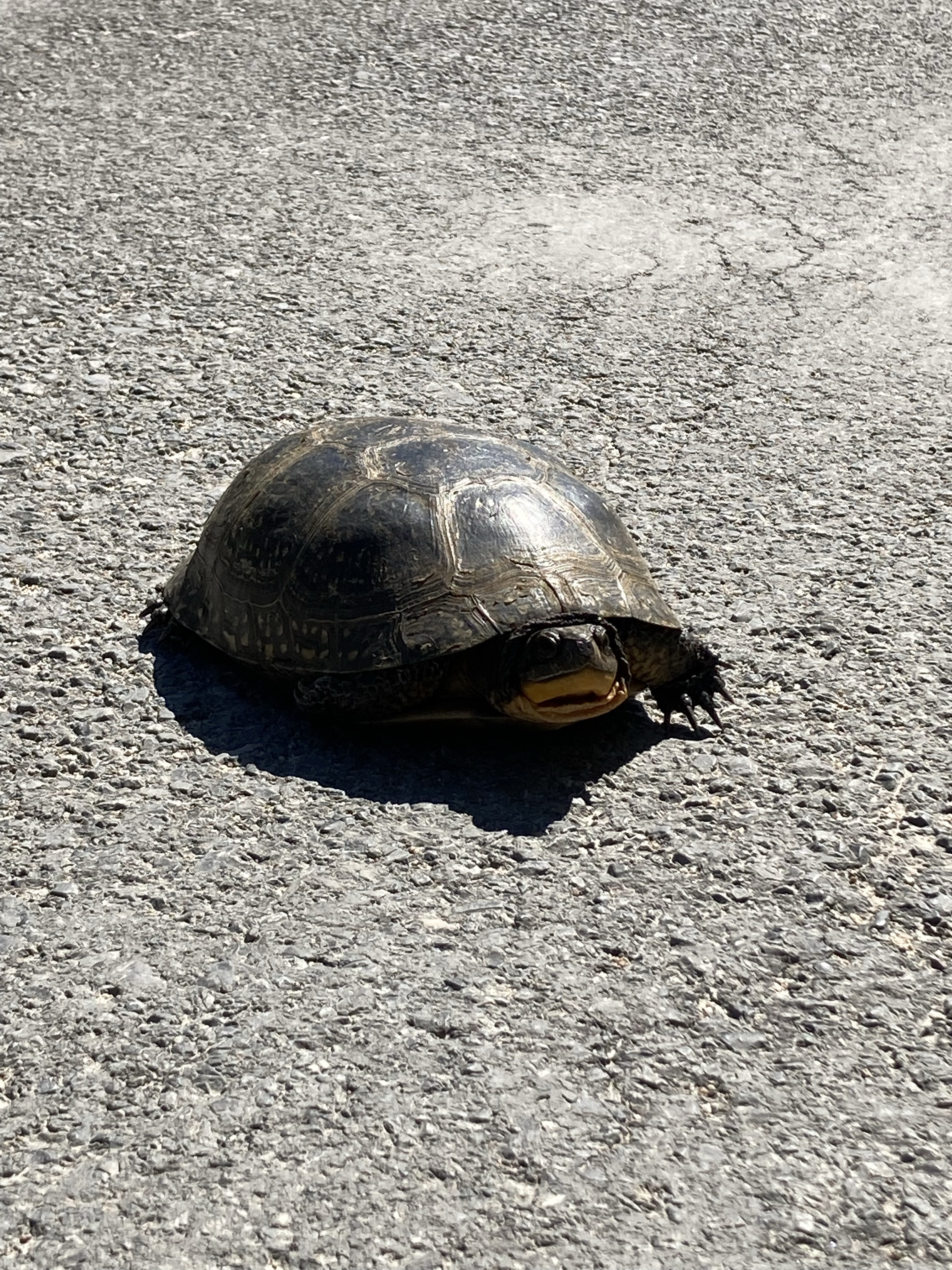 It turned out to be fairly sunny, and I got another sunburn, despite putting sunscreen on midway through the hike. On a stretch of road walk through farmland there was a turtle in the middle of the road, so I gently picked him up and moved him to the side he was headed for. Back at the van, it was not enticing to boil water to make a hot freeze dried meal when the weather was towards 30 degrees C. I also witnessed some black birds chasing off a crow. And my blister count had come in at seven.