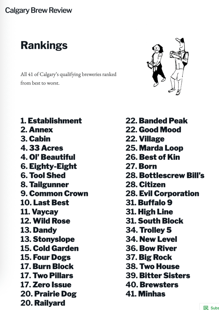 I stumbled across this fabulous resource. A ranking of all the breweries in Calgary, from folks with experience, who use a thorough points system. I’m not sure how long this site will stay up, so I’ll also link the reddit thread where I found it. Hopefully it remains active, as it gives great overviews and descriptions!