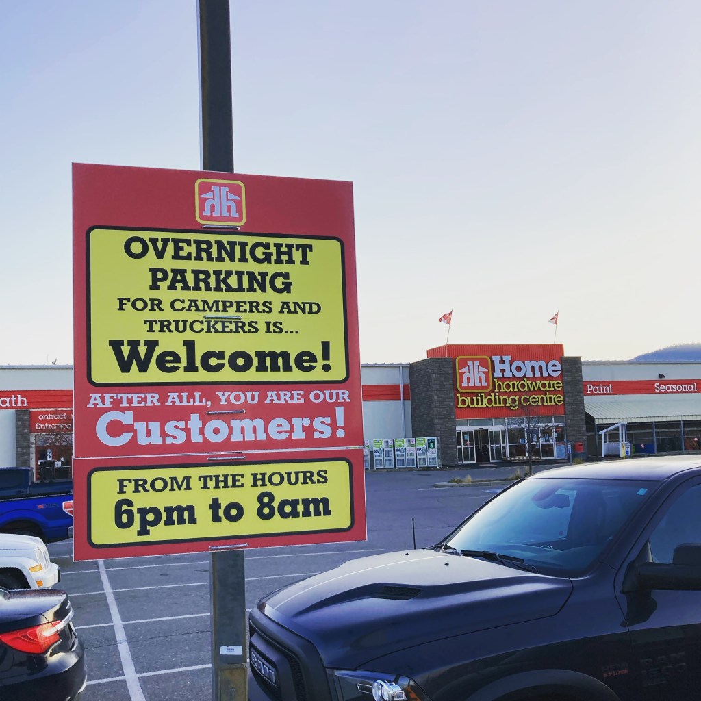 While the Walmart in Cranbrook did not allow overnight parking, I was pleased to find a welcoming sign at Home Hardware next door.