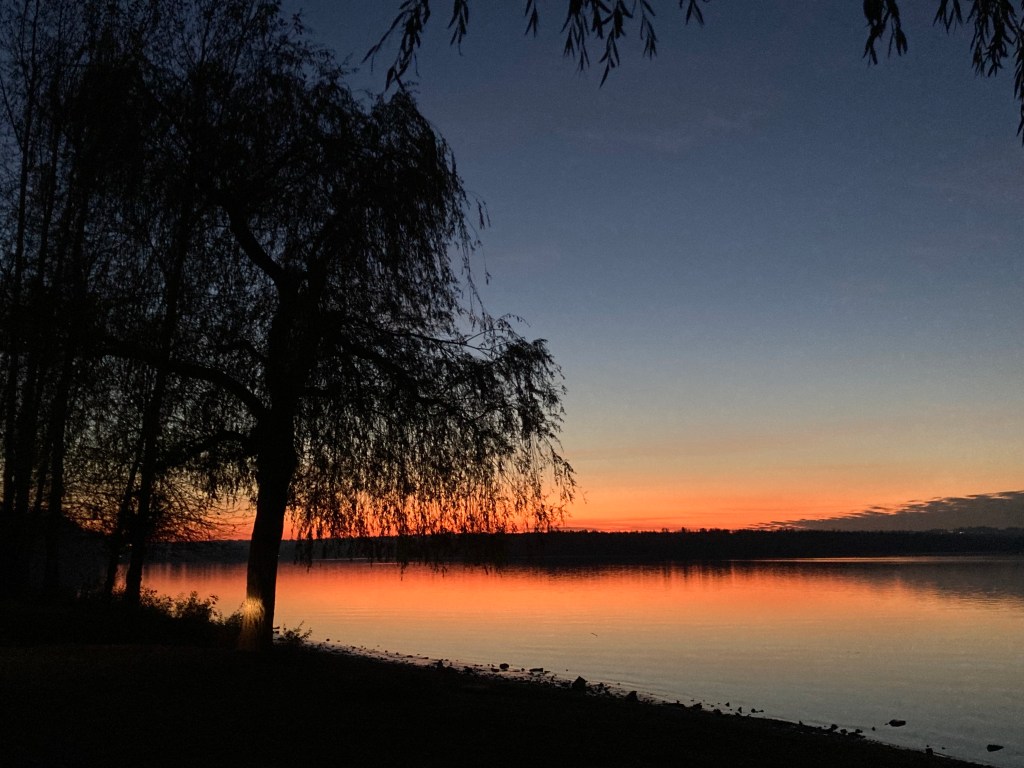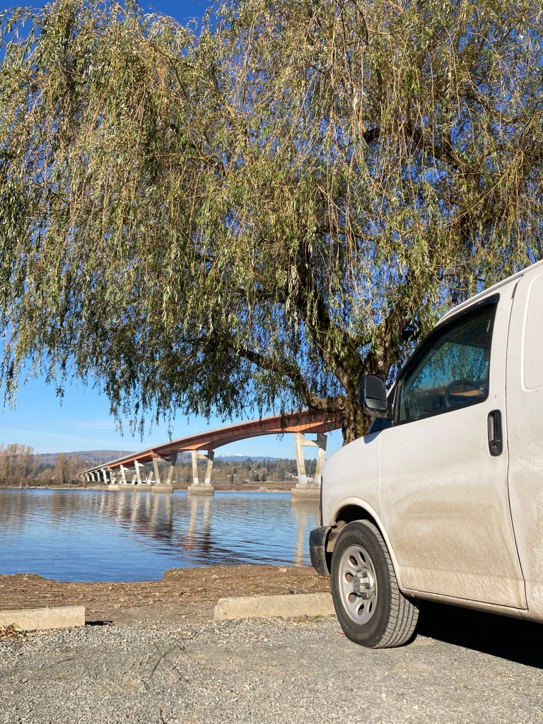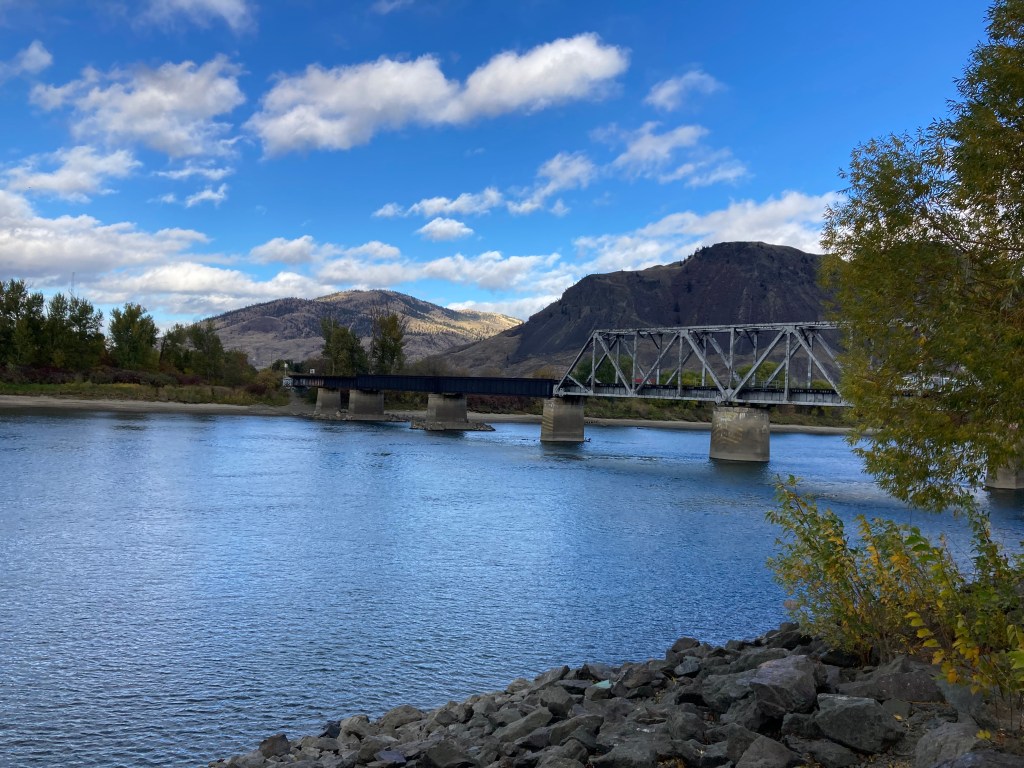 While driving from Salmon Arm towards Kamloops and scouting an overnight spot, I had one of those nights where plans fall through and you’re scrambling to find something nearby. Those nights are always frustrating. My chosen spot turned out to be a no-go, so I had to drive further and in the dark. The next morning I woke up to find that I was in a beautiful area – on a beach, near a train and bridge, with rolling hills and sun shining – so what was inconvenient and stressful in the moment had a good ending (this time).