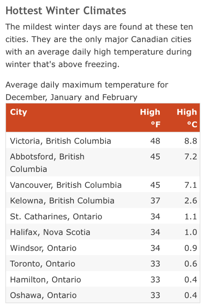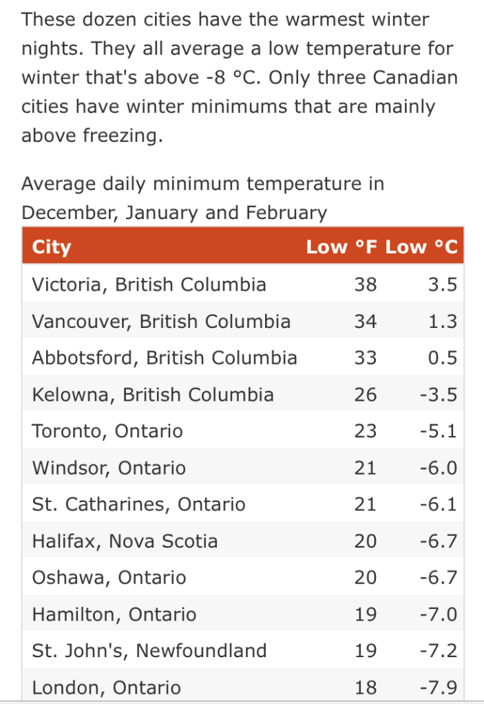 I did some research into the warmest cities in Canada during winter. The results are overwhelmingly southwestern BC (Victoria being the winner, followed by Vancouver, and Abbotsford) then southwestern Ontario.