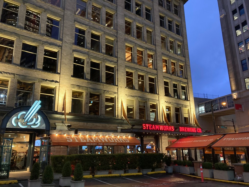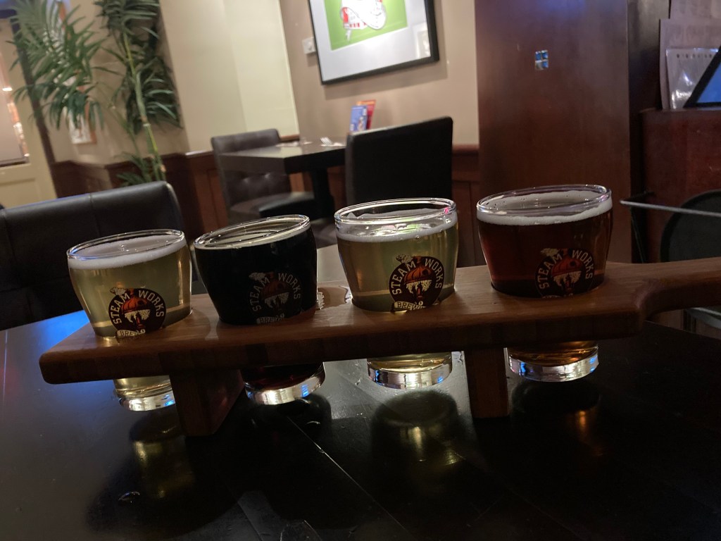 Following a day of exploring downtown Vancouver, I ended my day at Steamworks Brew Pub, on the edge of Gastown, across from the supposedly haunted Waterfront Train Station. My flight included a Kolsch, Pilsner, Lager, Red Ale, and Imperial Breakfast Stout (pretty standard). It was busy in there and there were dimmed lights to create a vibe. I do like my taproom experiences to be a bit more chill, and I don’t think I have the most favourable memory of the beer itself. It’s in a central location, overlooking the Vancouver Harbour, and it has more of a restaurant with beer feel. A quick look at their website confirms that their brewery taproom is in Burnaby, while this location is a steam-powered brew pub, which apparently is known for its 10 Tap Taster paddle.