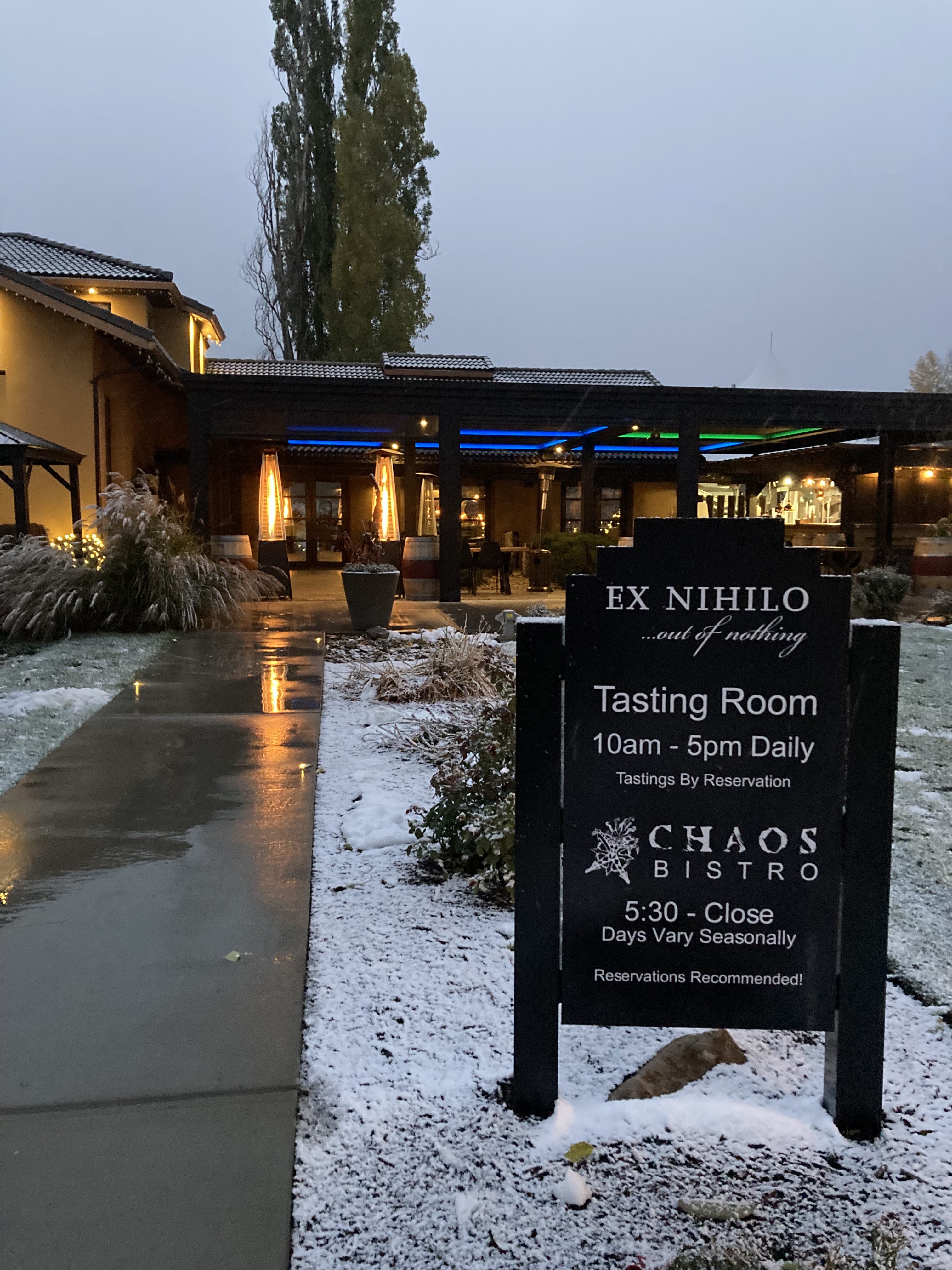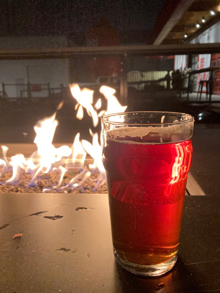 We drove in to Kelowna and went to Red Bird Brewing first. It was a snowy night. There was live music inside and the place was packed, but we managed to snag a booth outside next to a fire pit. They also gave us blankets to keep us warm. We could hear the band playing from outside, too. They had non-alcoholic beer for my friends (one was DD and the other no longer drinks). I’m not sure why I didn’t get a flight here – they have flights on their menu. Part of me wonders if they weren’t offering them outdoors because of the band playing. I don’t have a positive or negative memory of the beer, so take that as you will that it didn’t leave a lasting impression. But since that’s the case I would probably go back and give it another shot. It was a pretty big venue.