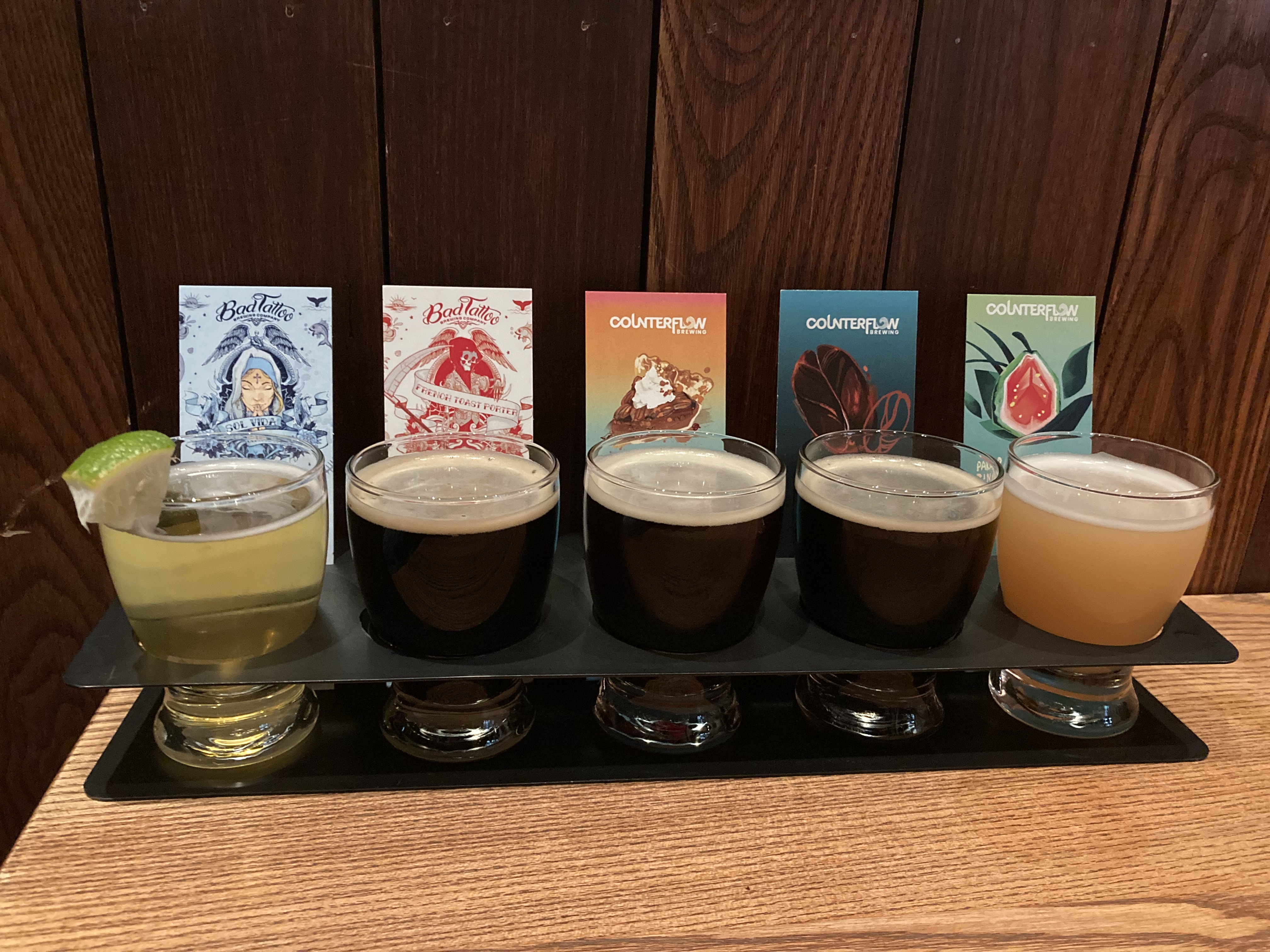 Next Up: Bad Tattoo Brewing Company (now closed). A smaller joint with an open kitchen layout. I’m a sucker for tattoo artistry. And based on the photo of my flight it looks like they had guest taps. Again – no memorable impression – but from the photo a french toast porter sounds pretty good.