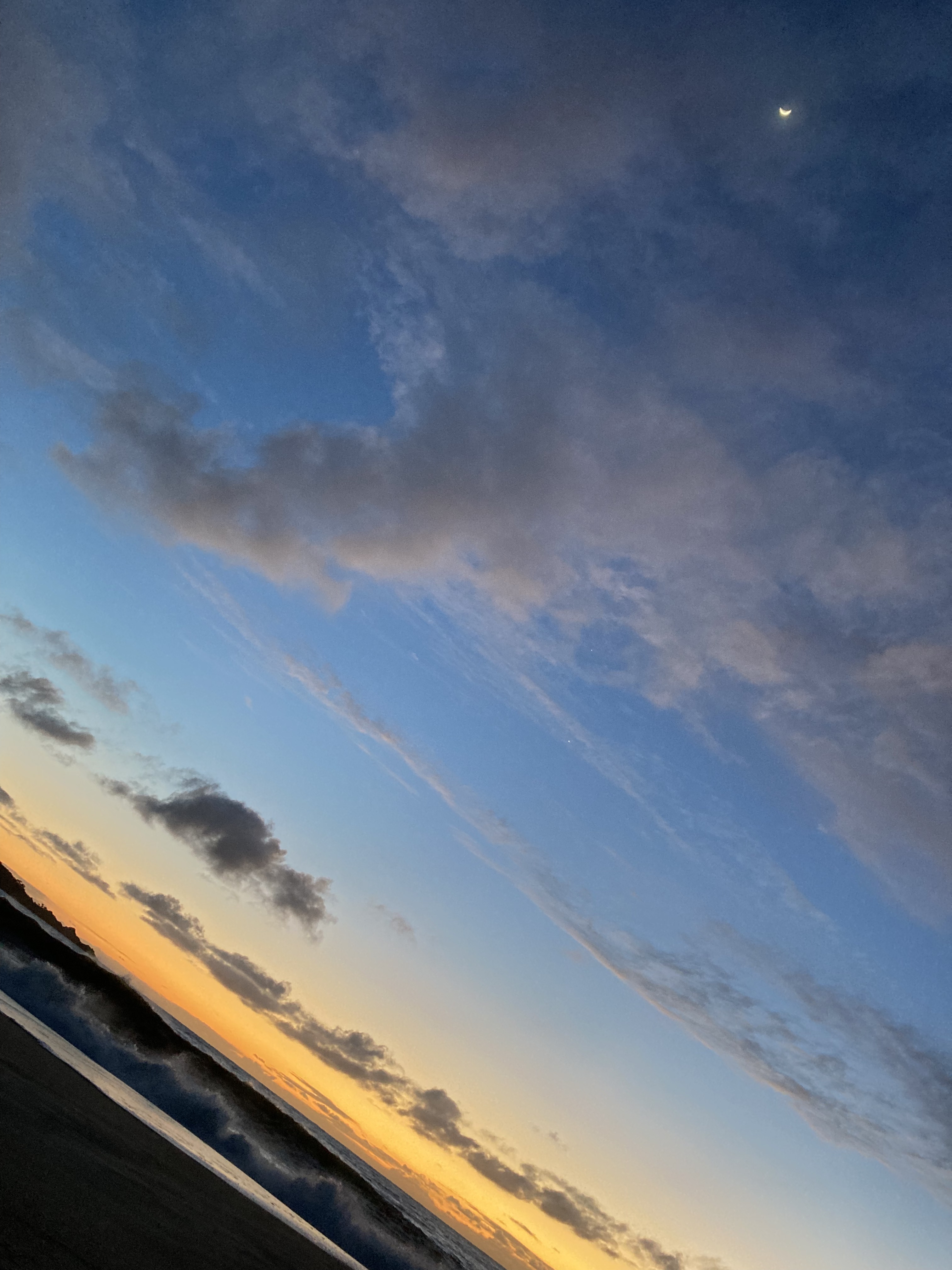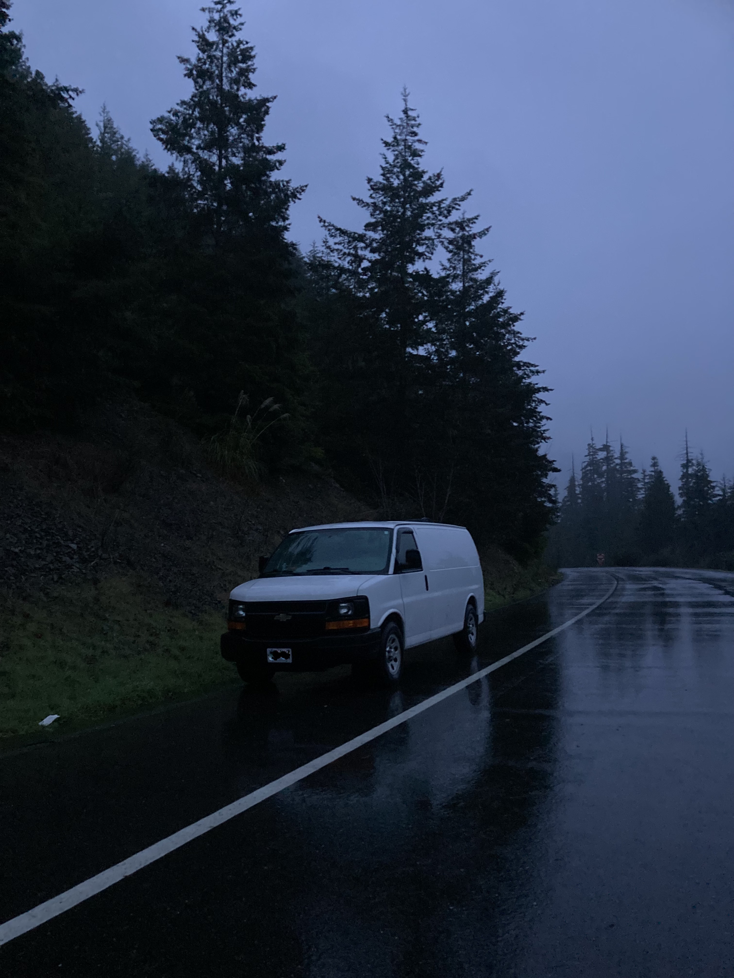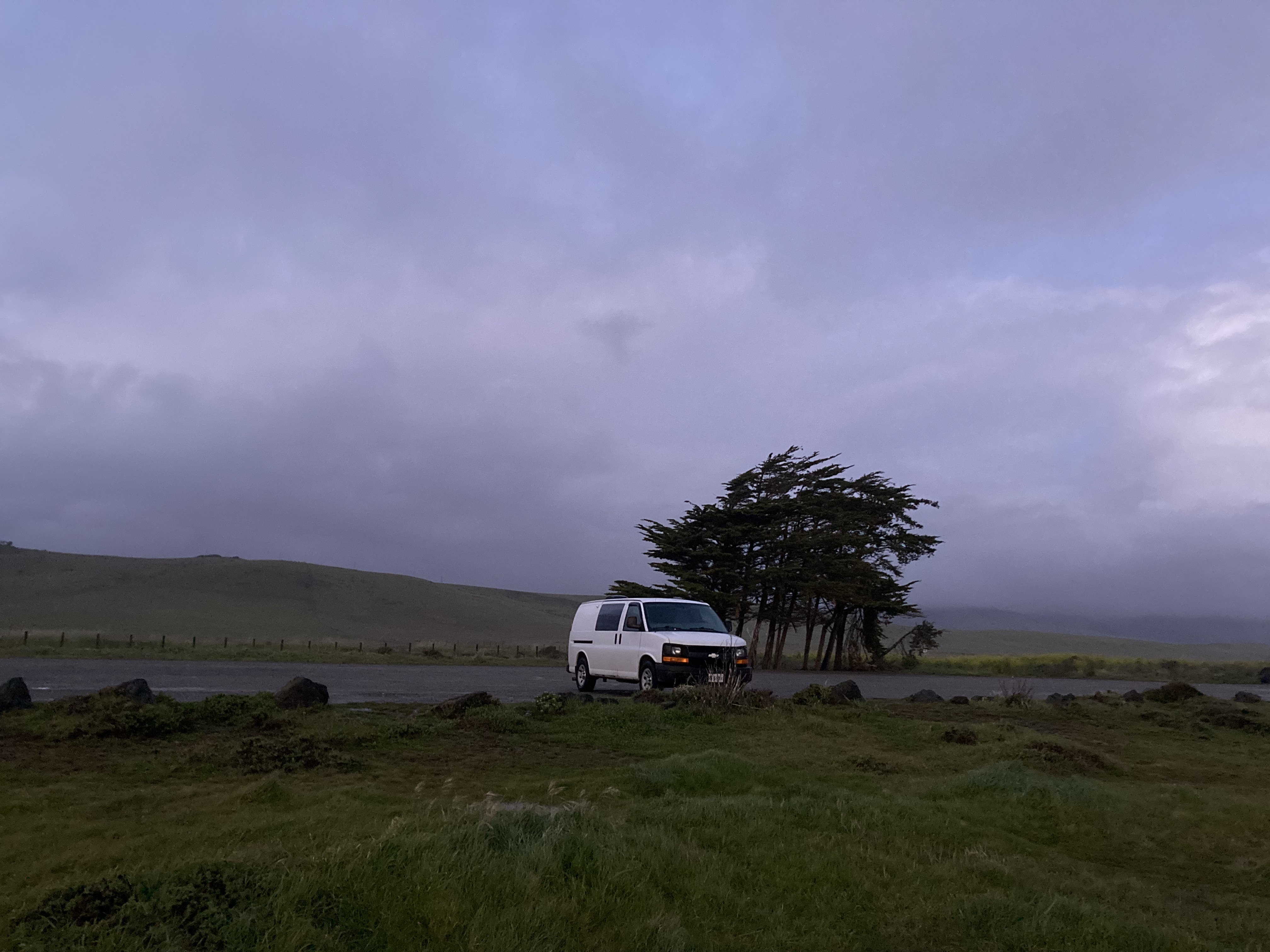 I took the 101 south and about 40 minutes out from Eureka ended up at a “vista point” (little turnouts or parking areas just off the highways, sometimes with a view) that allowed stays up to 8 hours. It was a moody night. I watched clouds quickly drift across the moon, above the silhouette of evergreen trees. I had the area to myself, hidden from view of the highway.