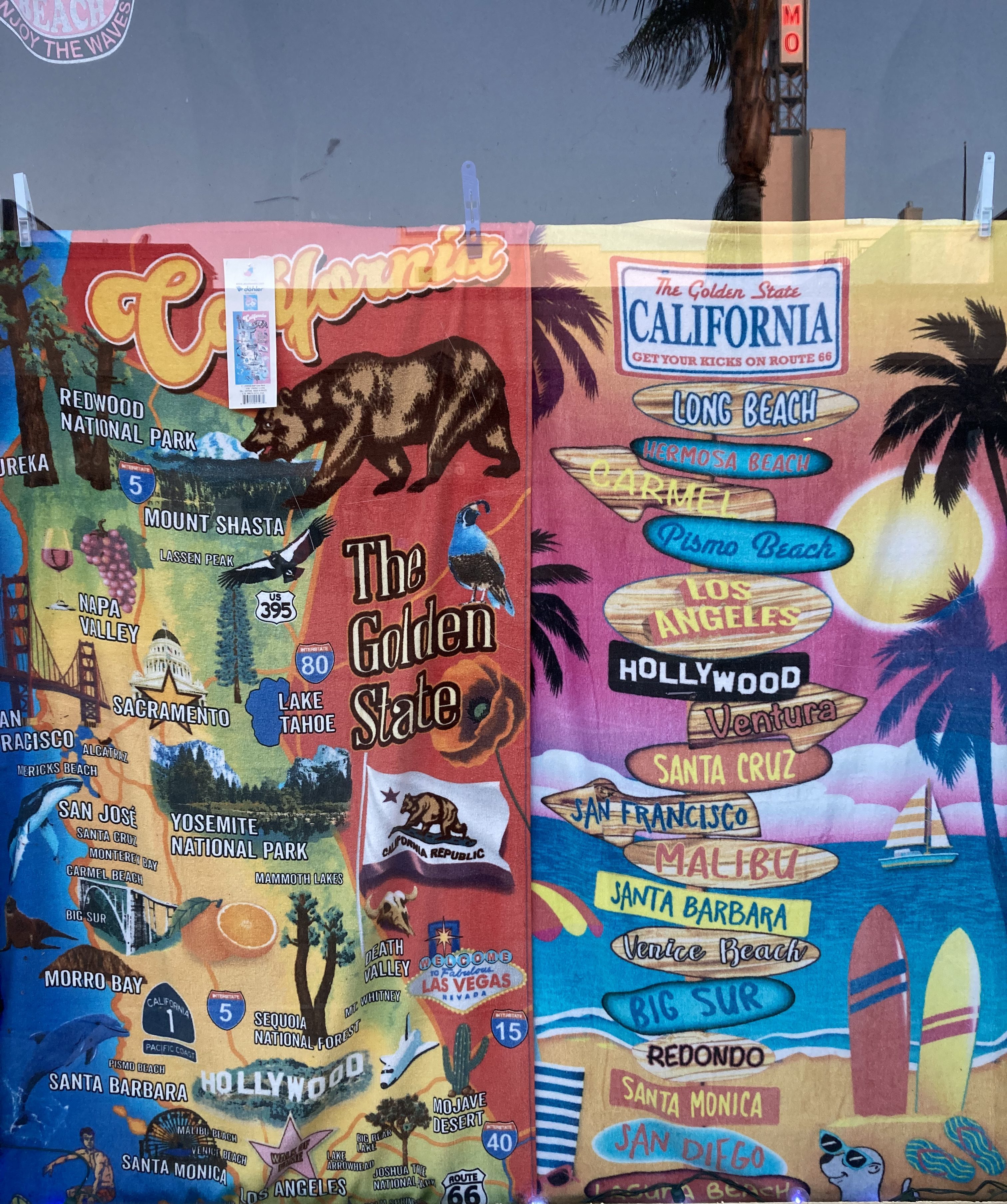 I also saw some towels in a tourist shop window that laid out pretty well all of the sights you’d want to see in California – in retrospect, I can say I got to almost all of them.