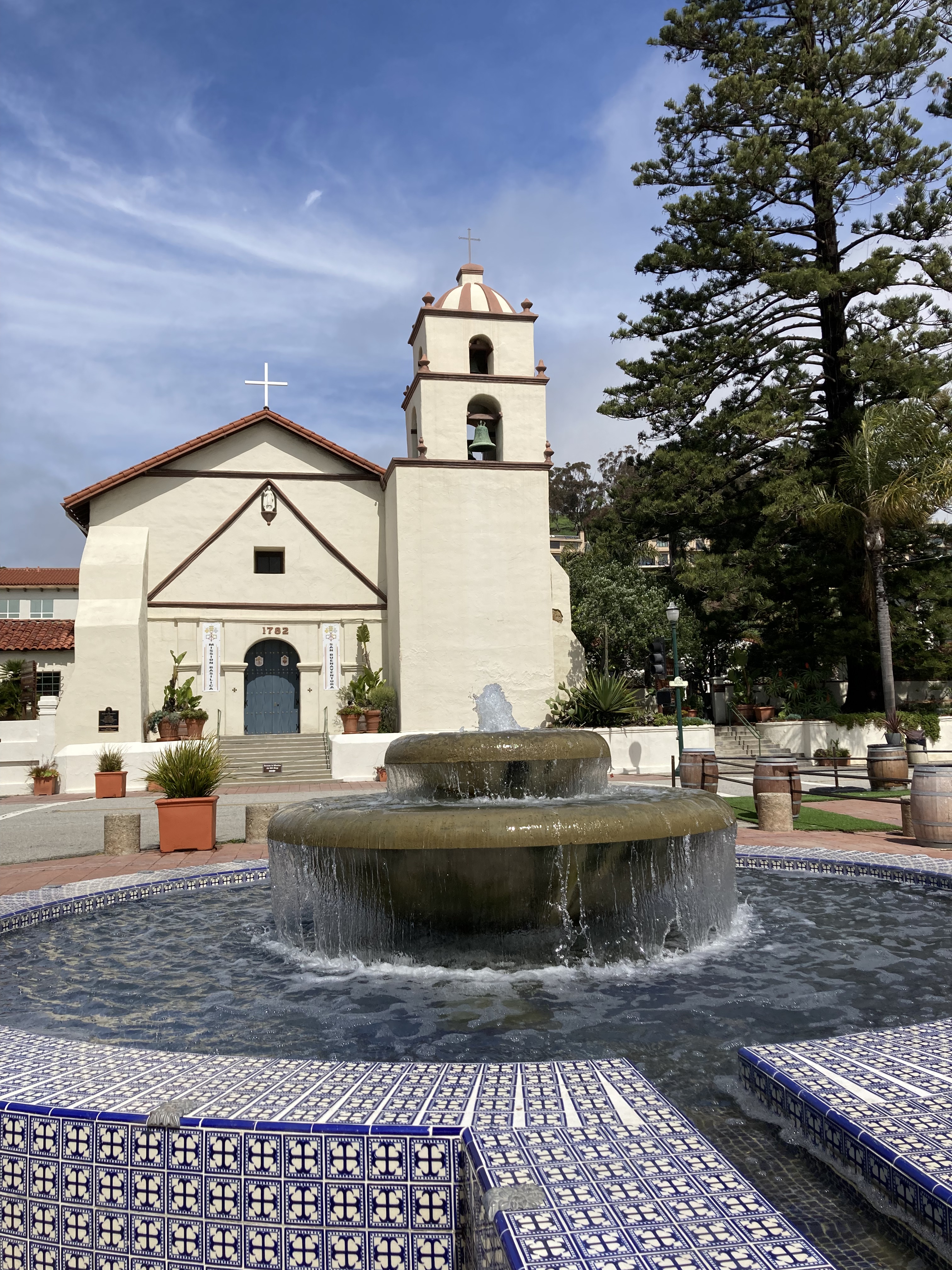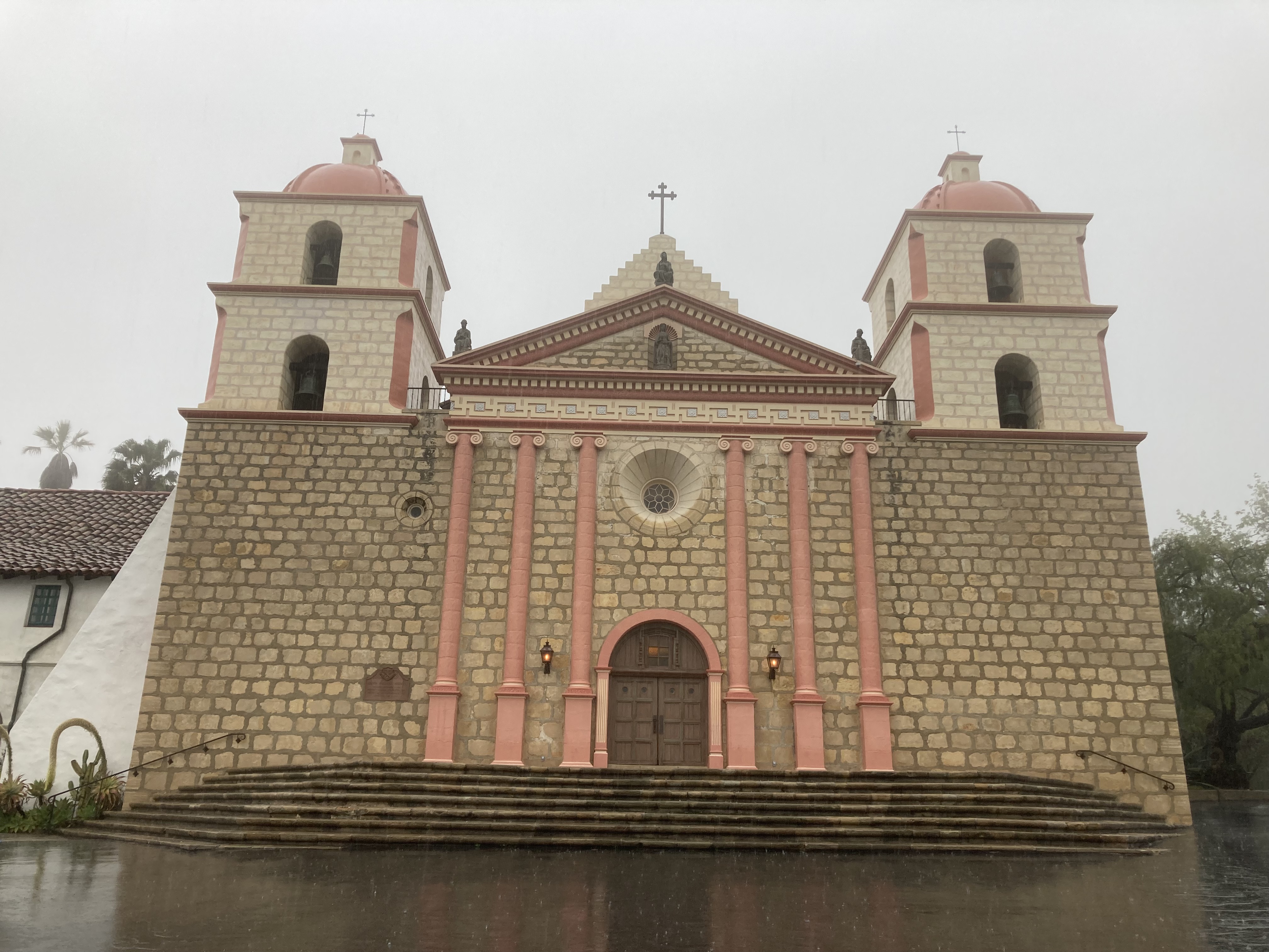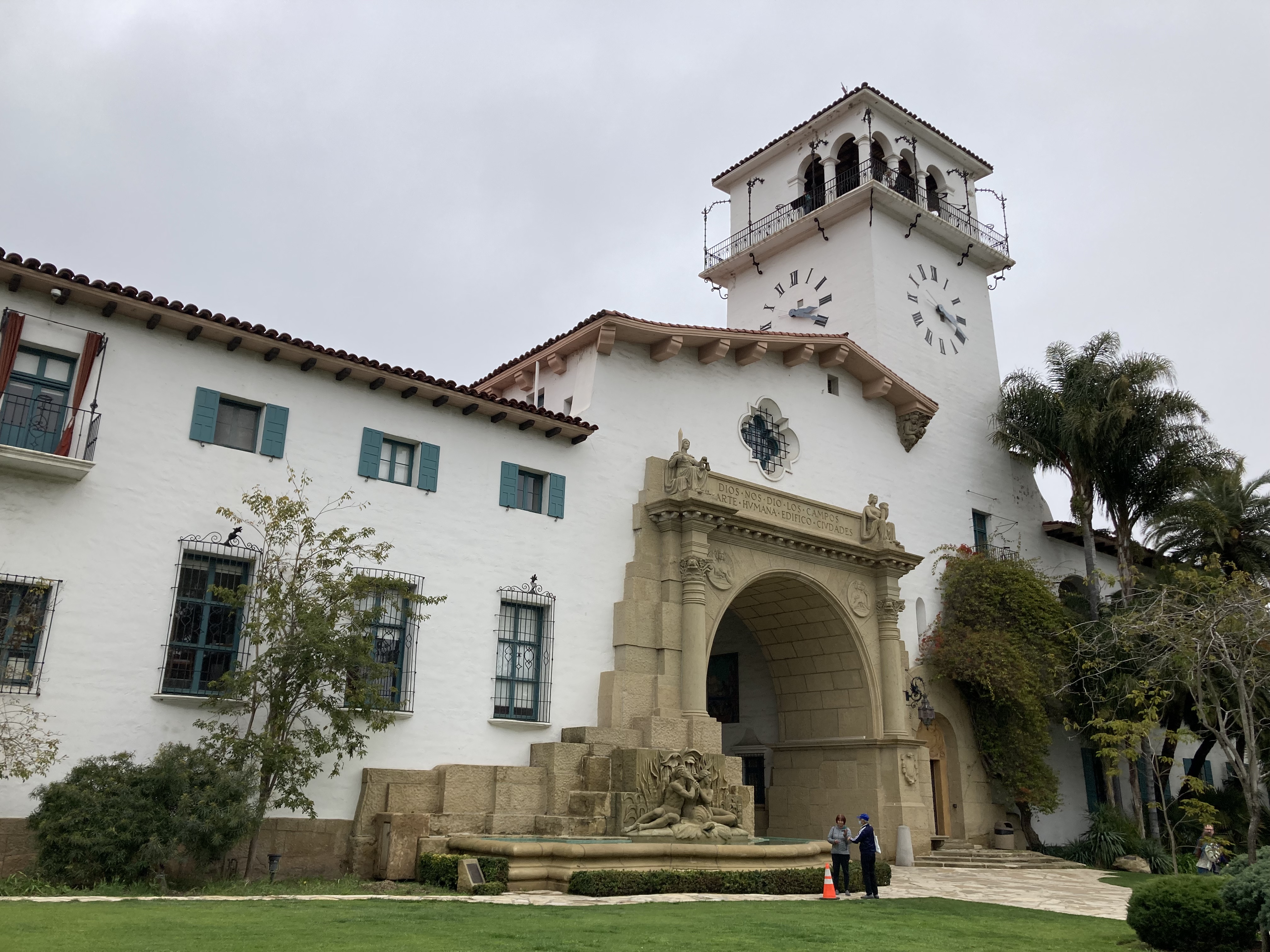 Santa Barbara is a city with a population of 89,000, located about 90 miles north of Los Angeles, on a south-facing strip of coast, sandwiched between the Santa Ynez Mountains and the Pacific Ocean. Like many other southern California coastal hubs, it has beaches, a pier, and a mission (a religious/ military outpost established by Spanish Catholic missionaries in the late 18th century to colonize natives). A characteristic feature of Santa Barbara is the Spanish colonial revival style buildings, with white stucco walls and red clay tile roofs, which were rebuilt after a major earthquake in 1925 and inspired by Mission Santa Barbara. The mediterranean climate and style has also contributed to the nickname “American Riviera”.