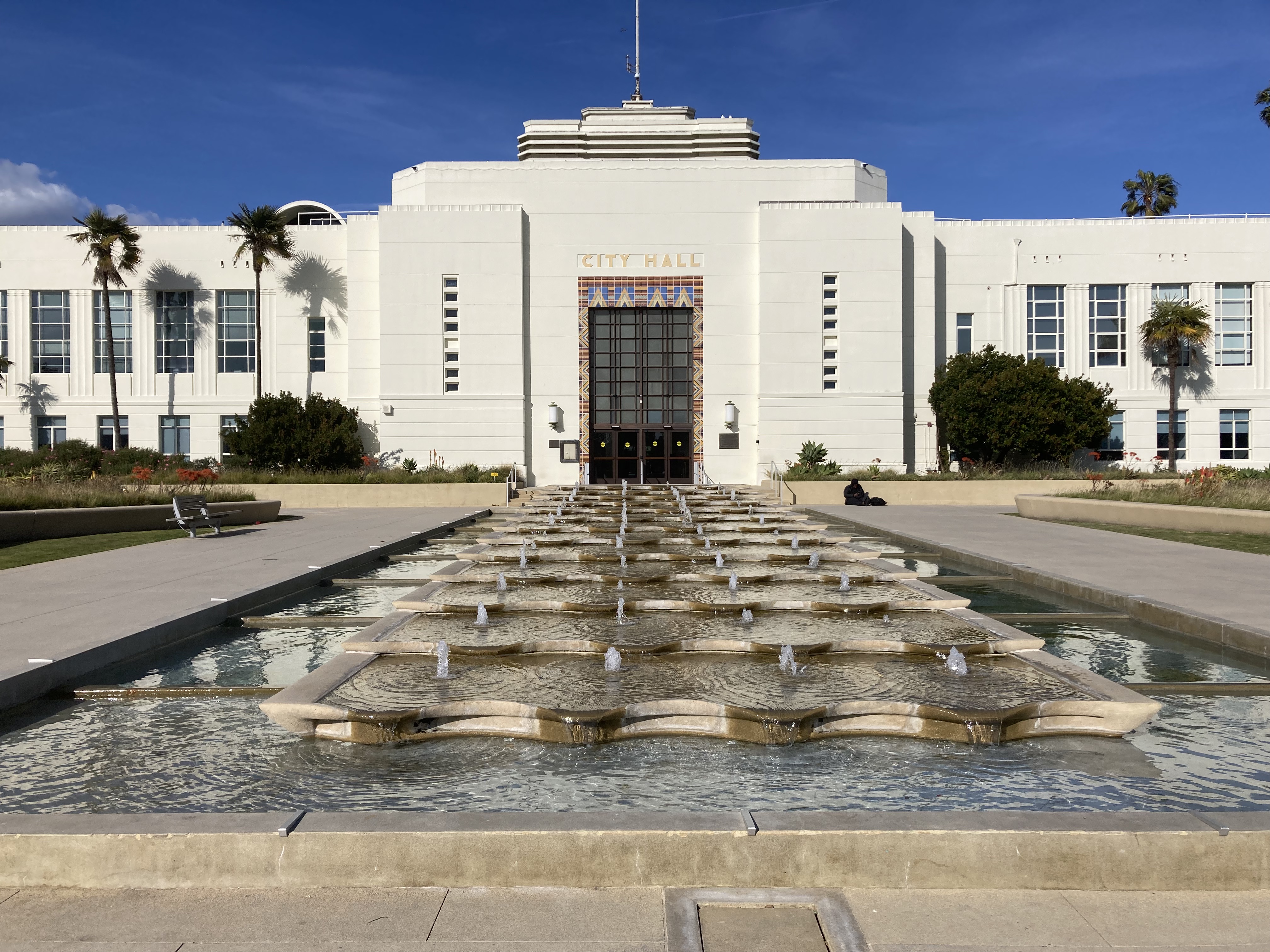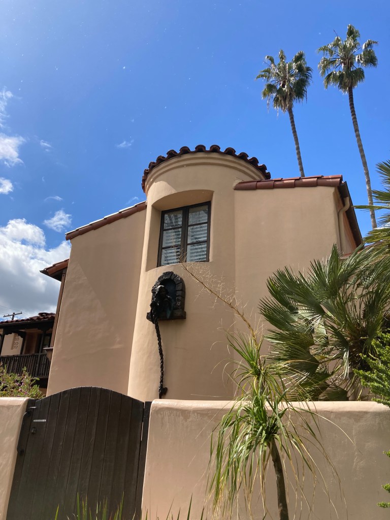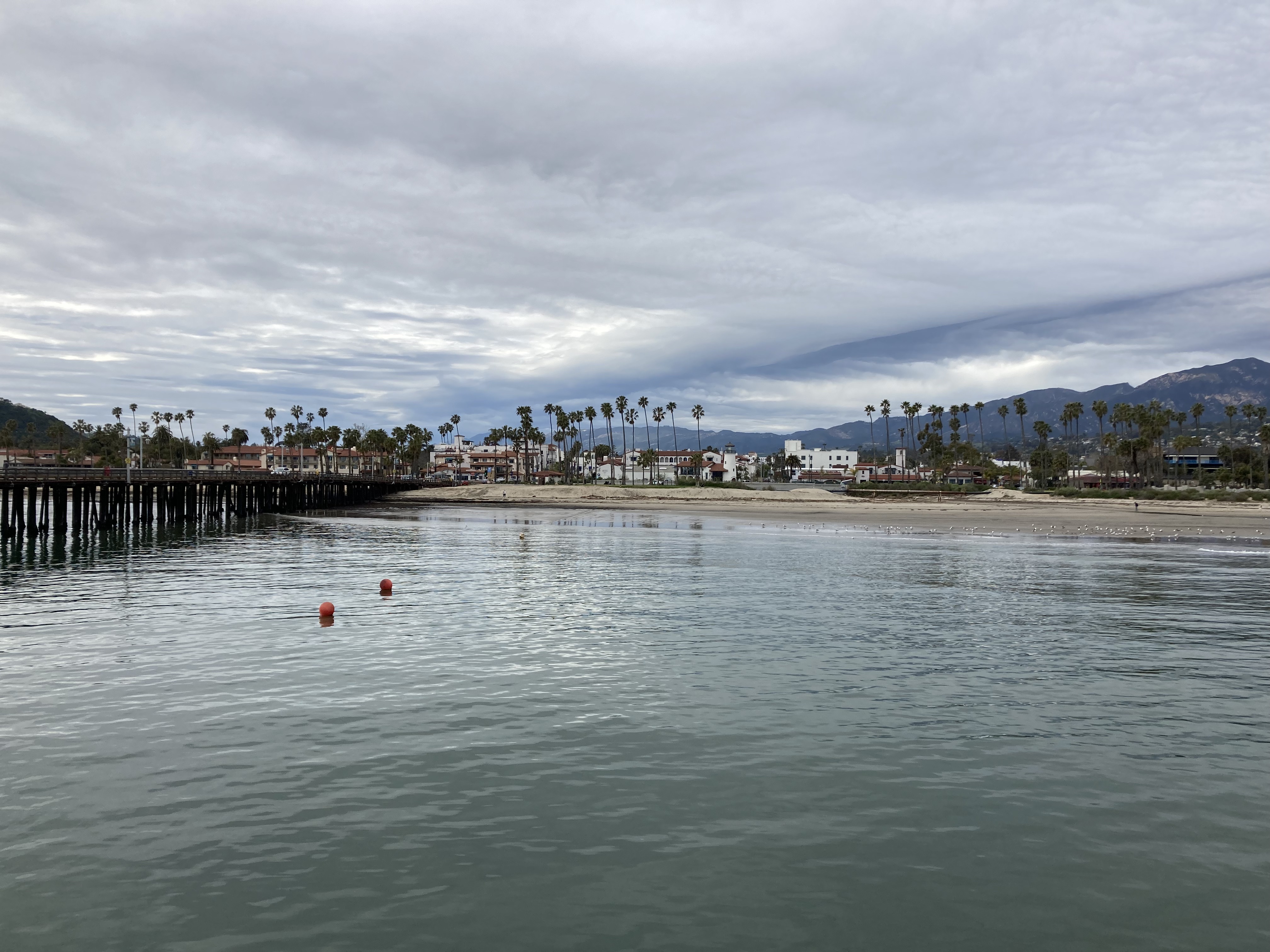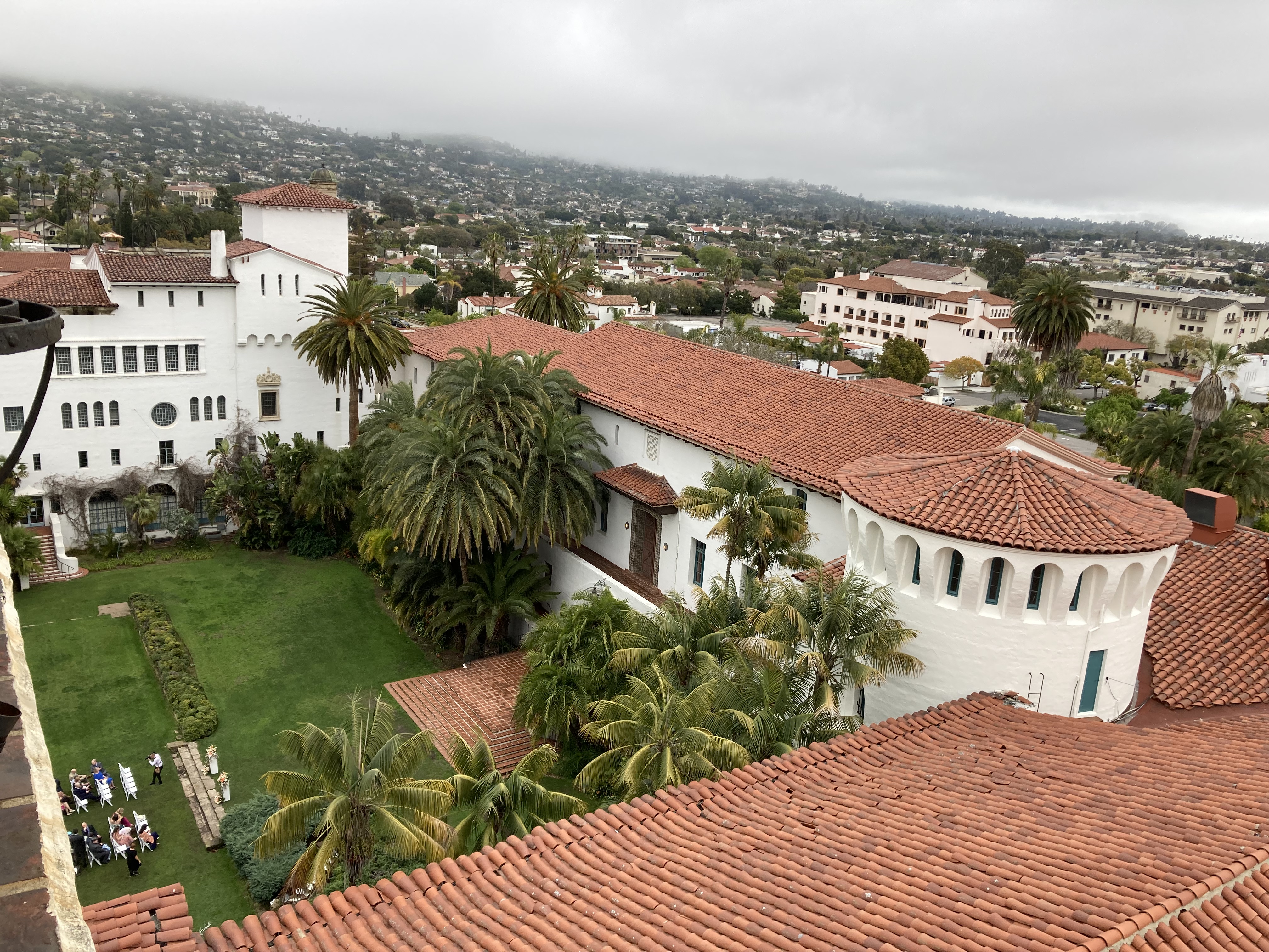 Santa Barbara is a city with a population of 89,000, located about 90 miles north of Los Angeles, on a south-facing strip of coast, sandwiched between the Santa Ynez Mountains and the Pacific Ocean. Like many other southern California coastal hubs, it has beaches, a pier, and a mission (a religious/ military outpost established by Spanish Catholic missionaries in the late 18th century to colonize natives). A characteristic feature of Santa Barbara is the Spanish colonial revival style buildings, with white stucco walls and red clay tile roofs, which were rebuilt after a major earthquake in 1925 and inspired by Mission Santa Barbara. The mediterranean climate and style has also contributed to the nickname “American Riviera”.