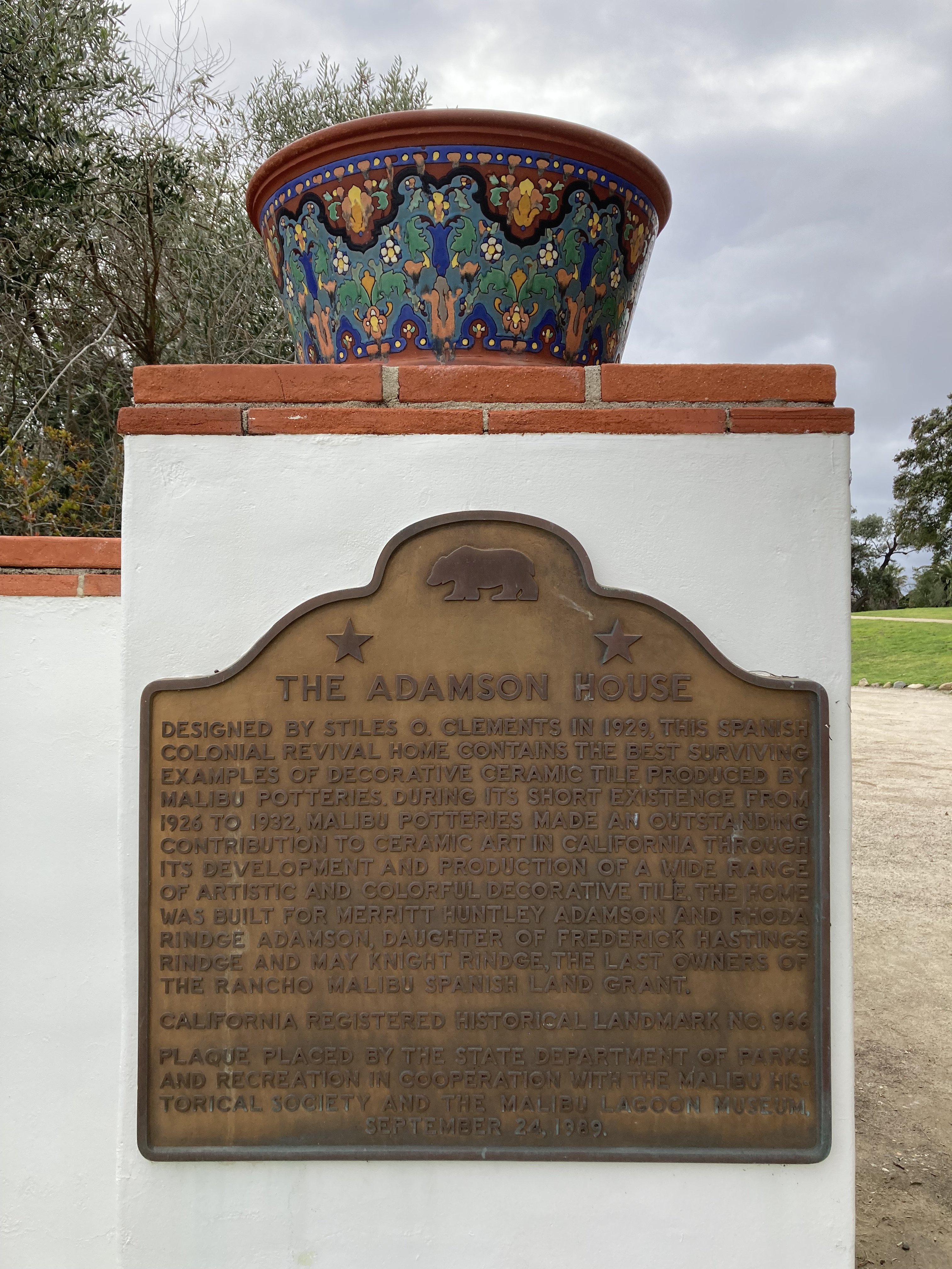 Then I went to the Adamson House. While I didn’t get to tour the inside of the house, there was still a lot to take in outside on the property, which had informational plaques. This house was completed in 1930 in the Spanish Colonial Revival style. It is known for its preservation of decorative ceramic tile, both inside the house and on the grounds, produced by Malibu Potteries. Local clay deposits were used to make the tiles from 1926-32, with Malibu Potteries operating a half mile from the Malibu Pier, on the beach. The Adamson House is located by Malibu Lagoon, where Malibu Creek meets the Pacific Ocean, creating a unique fresh water and salt water habitat.