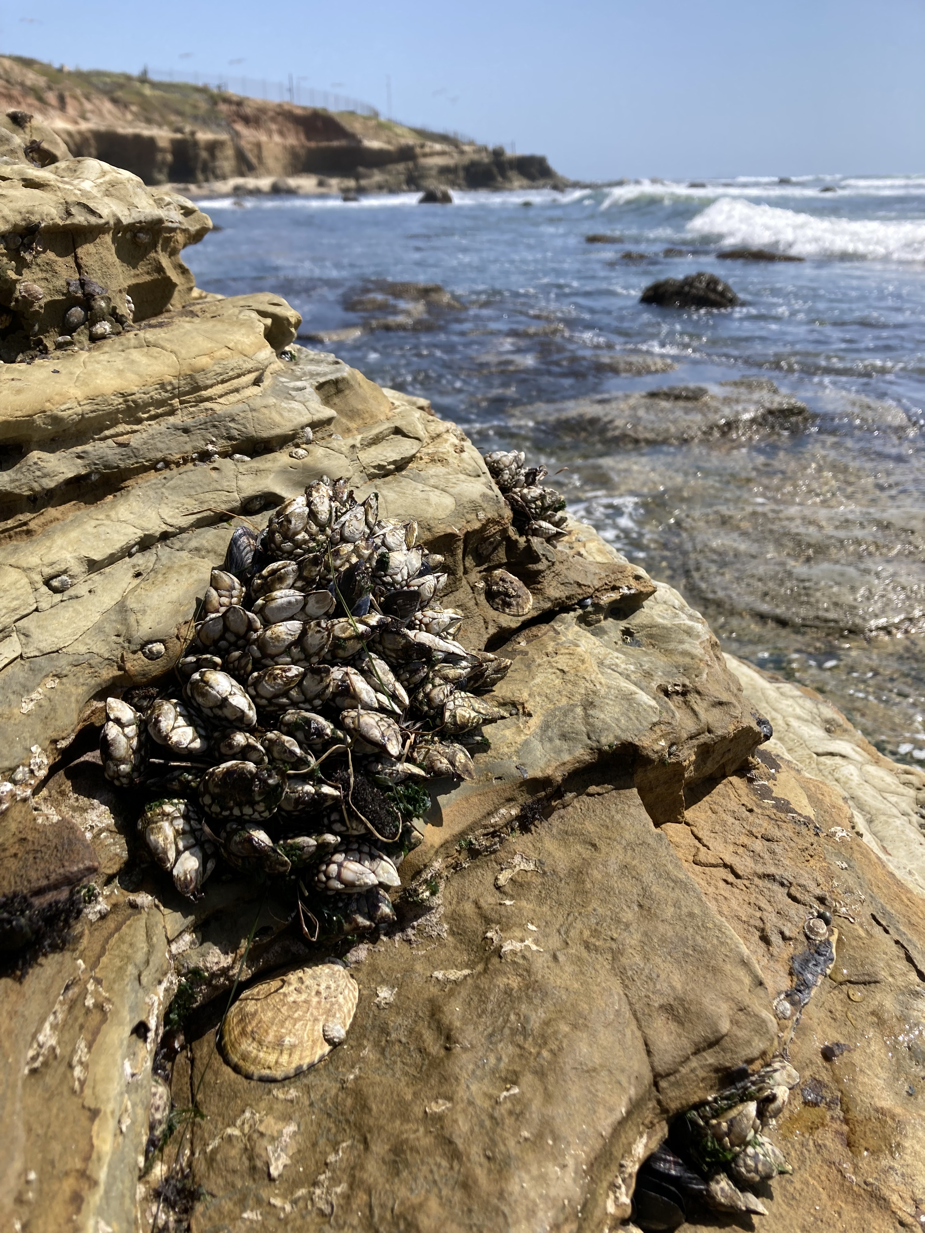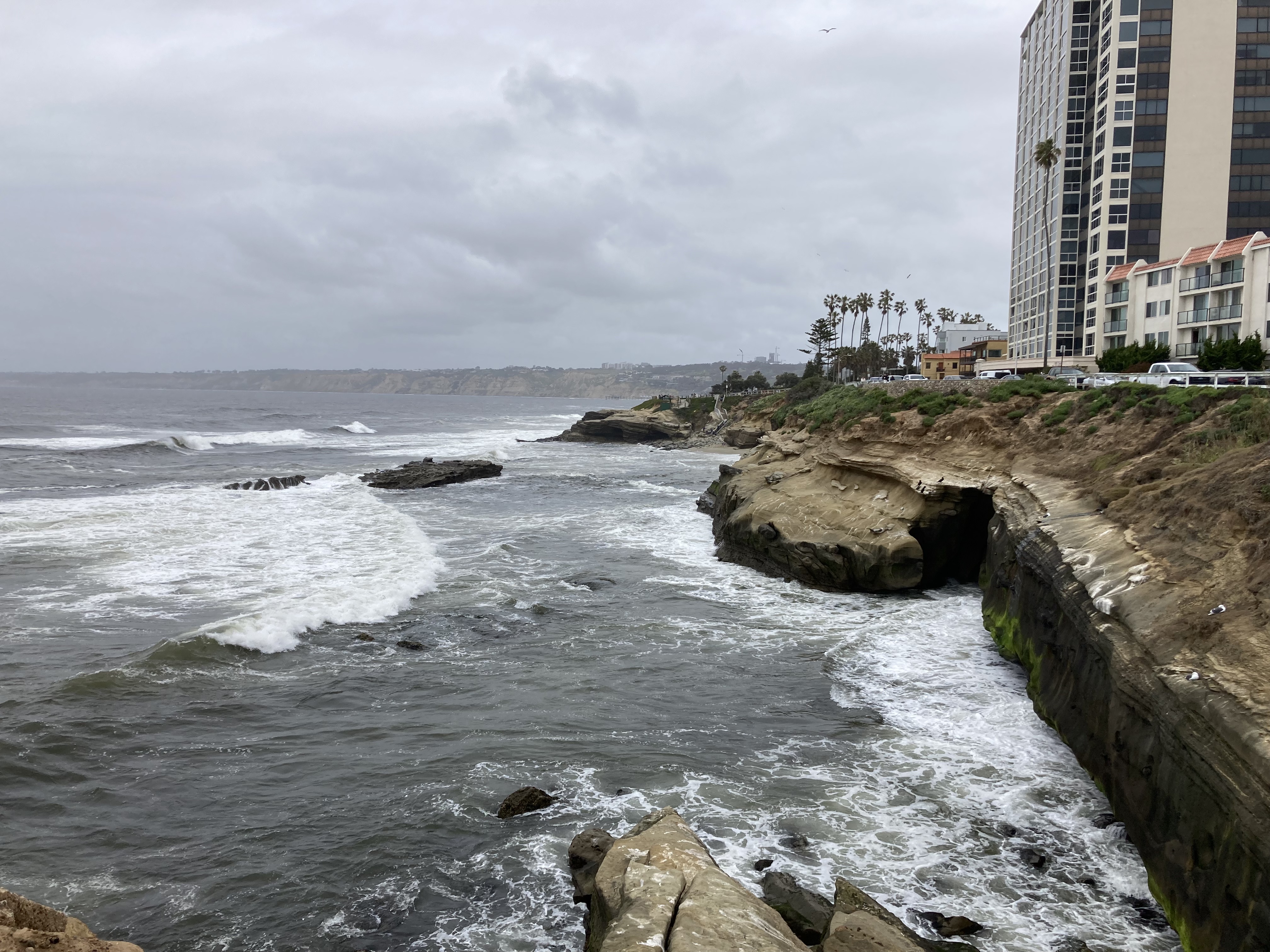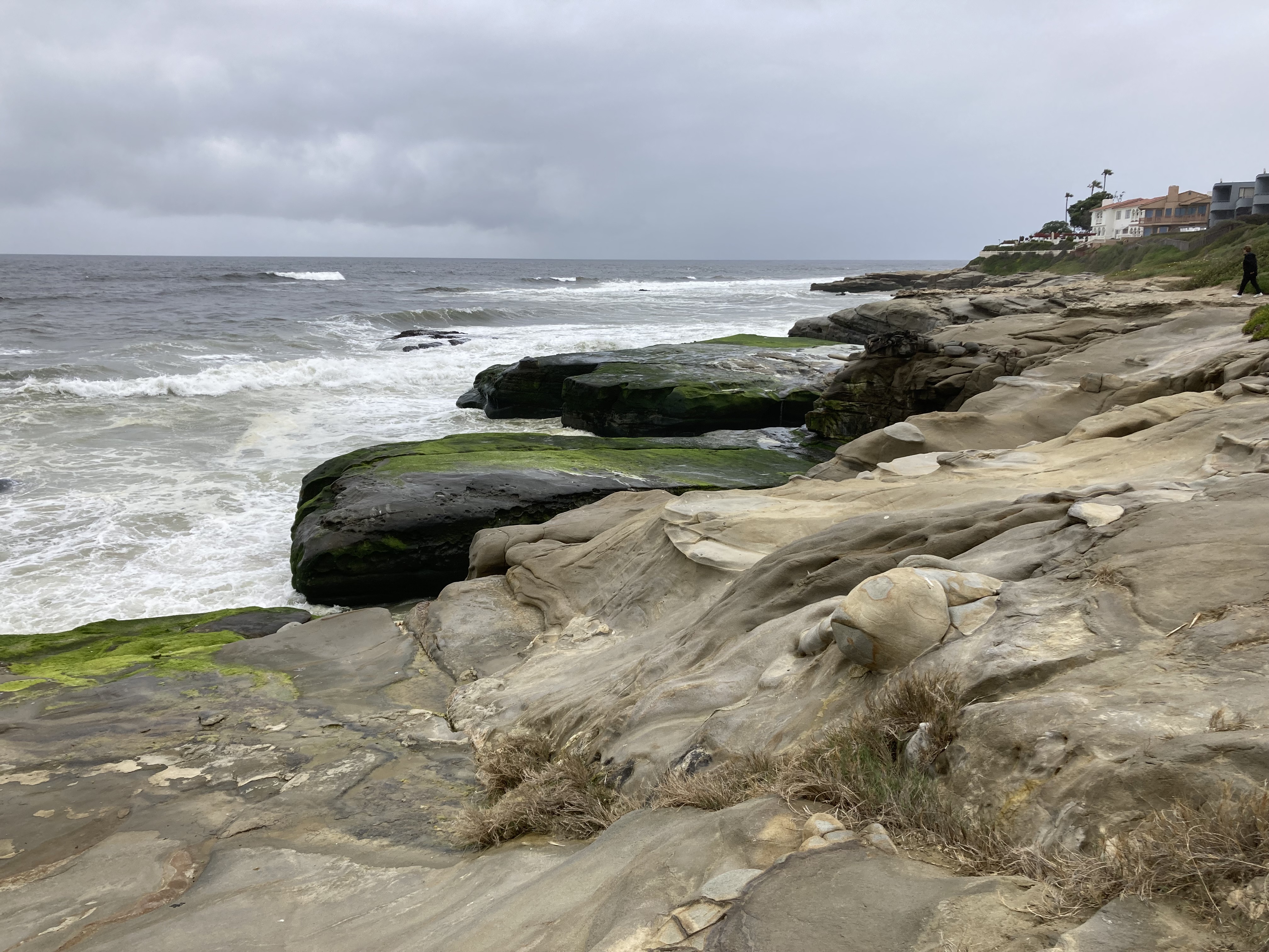 A little south of here is Windansea Beach, revered as a surfing spot, with a historic surf shack (I was sad there were no palm fronds on the roof when I was there). I must have been here at high tide, because waves were crashing up into the crevices of the sandstone rocks, and there was no sand to be seen.