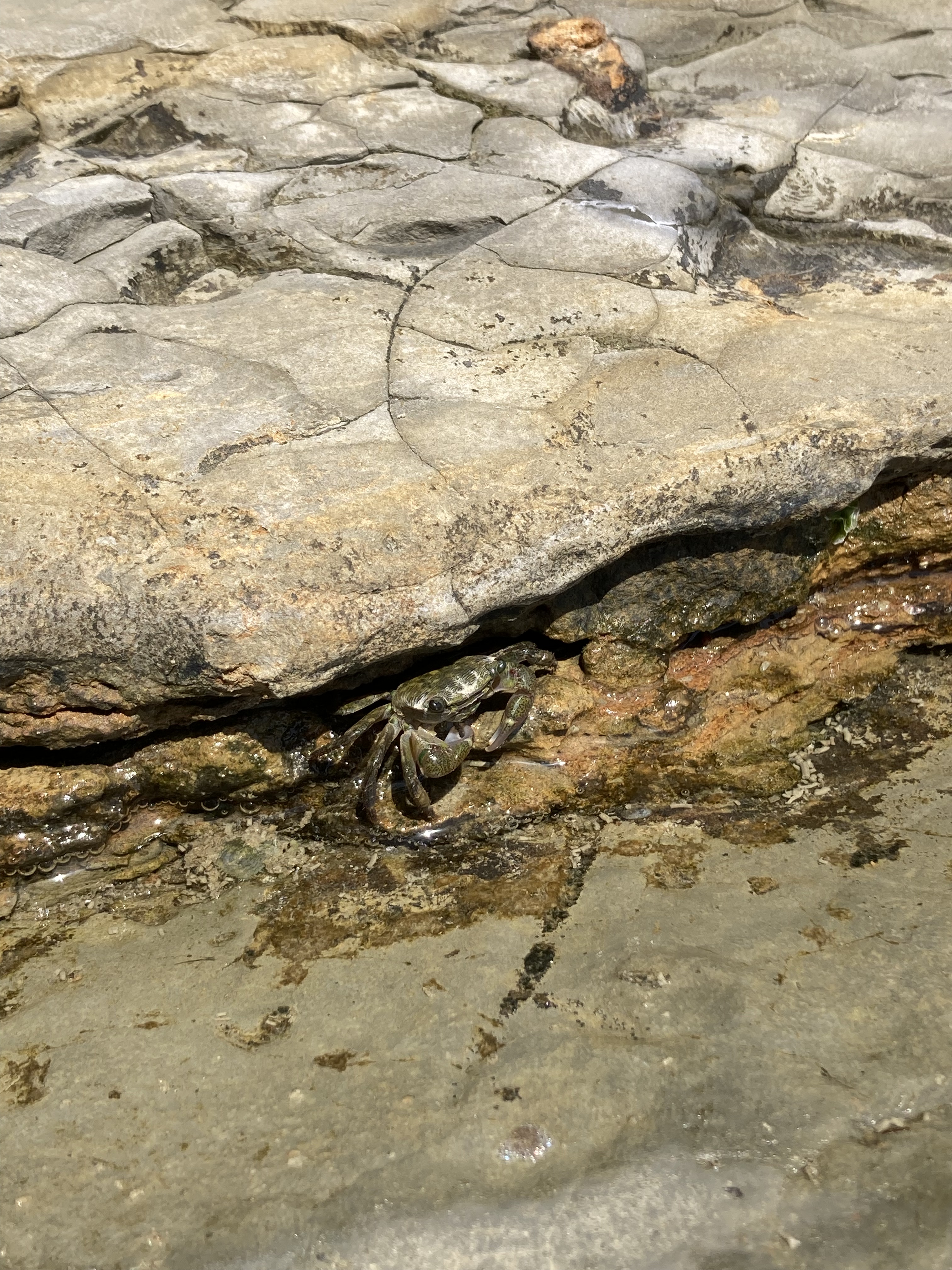 The tide pools and coastal area was beautiful to explore. The highlight of this part of my morning was my encounter with some crabs. In a little pool of water up on the rocks you could see lots of little crabs hidden under folds of rock on the outer edges of the pool. They hid if I moved, but after staying still for a while they would slowly emerge, move around, feed. At one point I moved around the pool to get another view, and suddenly I let out a blood curdling scream – purely reactionary and out of my control – as I saw something move across my shoe in my peripheral vision. It took my mind a second to catch up with my body’s reaction, at which point I started laughing because it was just a crab scuttling over my shoe. But if anyone heard me they were probably wondering what had happened. I just hadn’t expected these crabs to get anywhere near me, let alone crawl over me. I was flattered. I continued to watch a little crab come out, feed, and sun himself. It made my day.